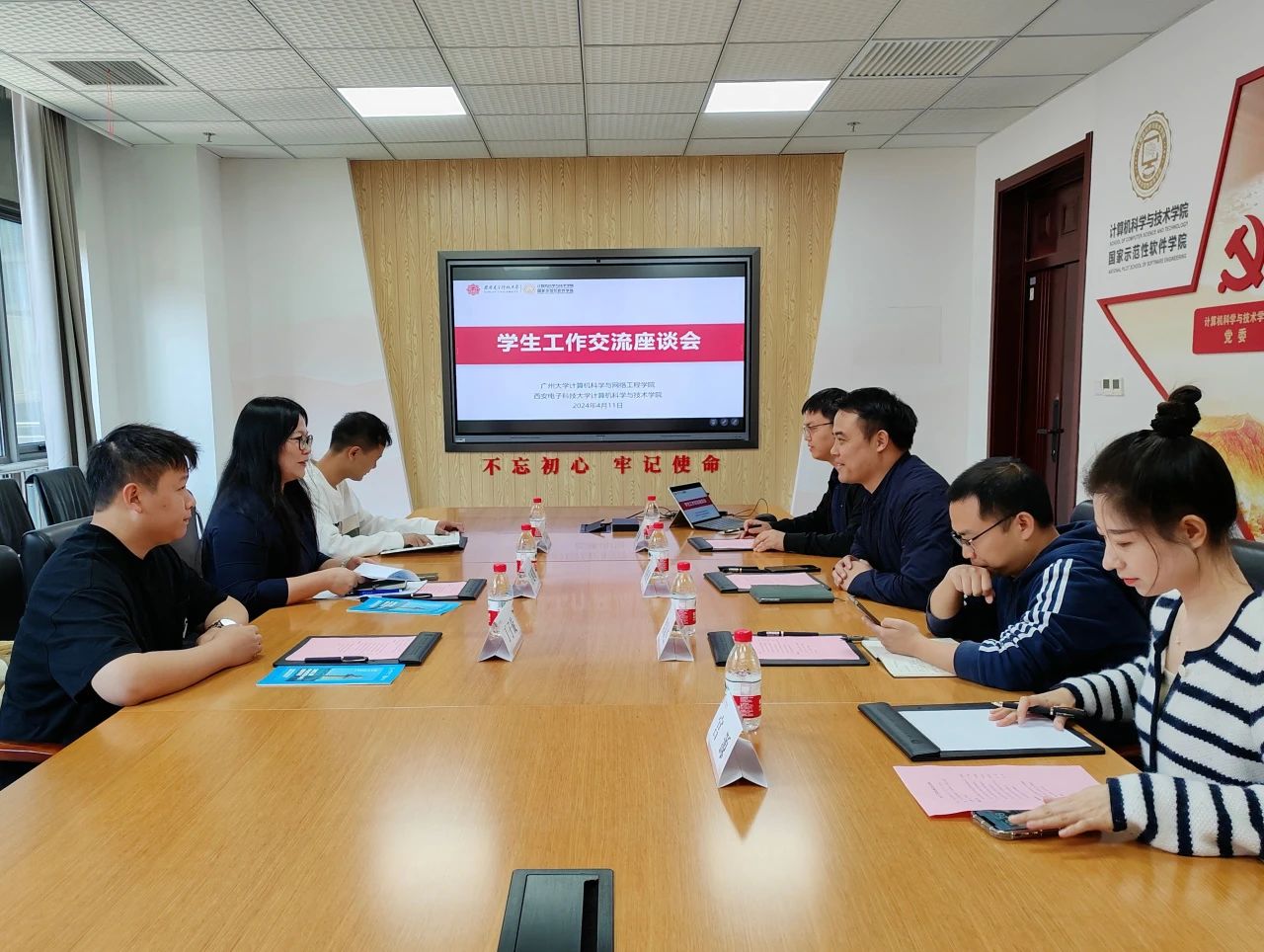 4月11日上午,学生工作交流座谈会在南校区网安大楼A1-222会议室召开。西电计算机科学与技术学院党委副书记黄成龙、辅导员党支部书记梁双杰、团委书记李栋、辅导员宫源以及广州大学计算机科学与网络工程学院党委副书记吕延明、辅导员肖章益、丁子旋参会。