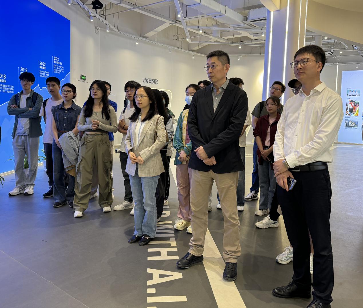学院师生一行参观了科大讯飞AI+科技园区展厅,在工作人员的带领和解说下,学院师生进一步了解了科大讯飞在语音识别领域以及在AI+教育、医疗、城市、工业、产教融合、智能服务和企业数字化等方面的成果及应用,观看了讯飞星火认知大模型功能演示。