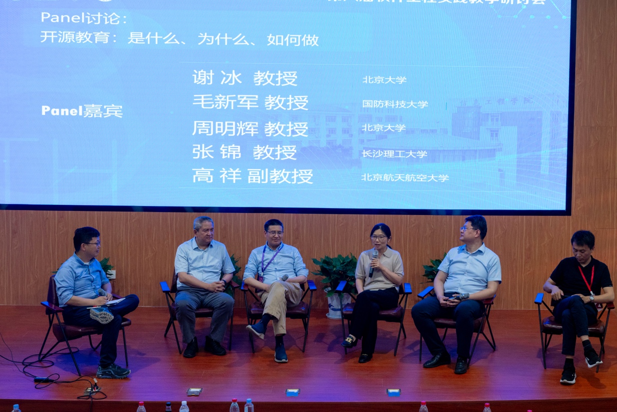 在Panel讨论环节中,北京大学科学研究部部长谢冰教授、国防科技大学毛新军教授、北京大学周明辉教授、长沙理工大学张锦教授、北京航空航天大学高祥副教授围绕“开源教育:是什么、为什么、如何做”等议题展开激烈的讨论与交流,展现了当前开源教育的先进理念,为科学的构建软件工程专业实践教学体系提供了宝贵的经验和指导。