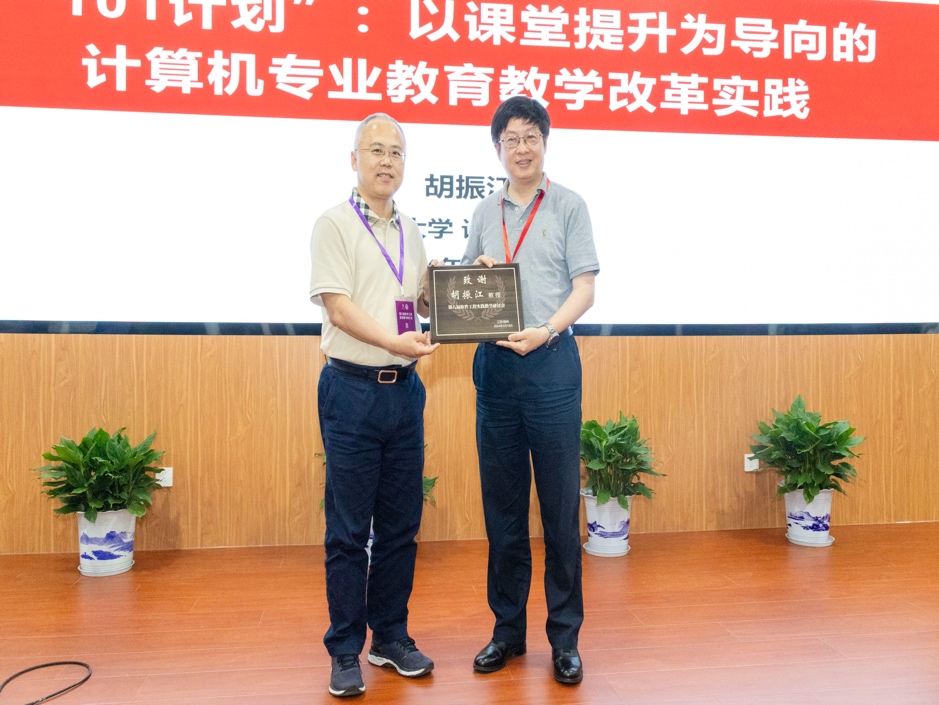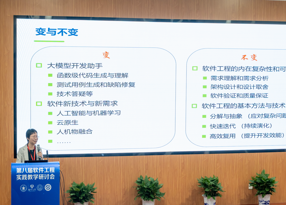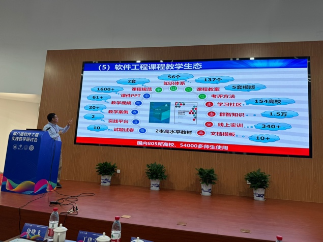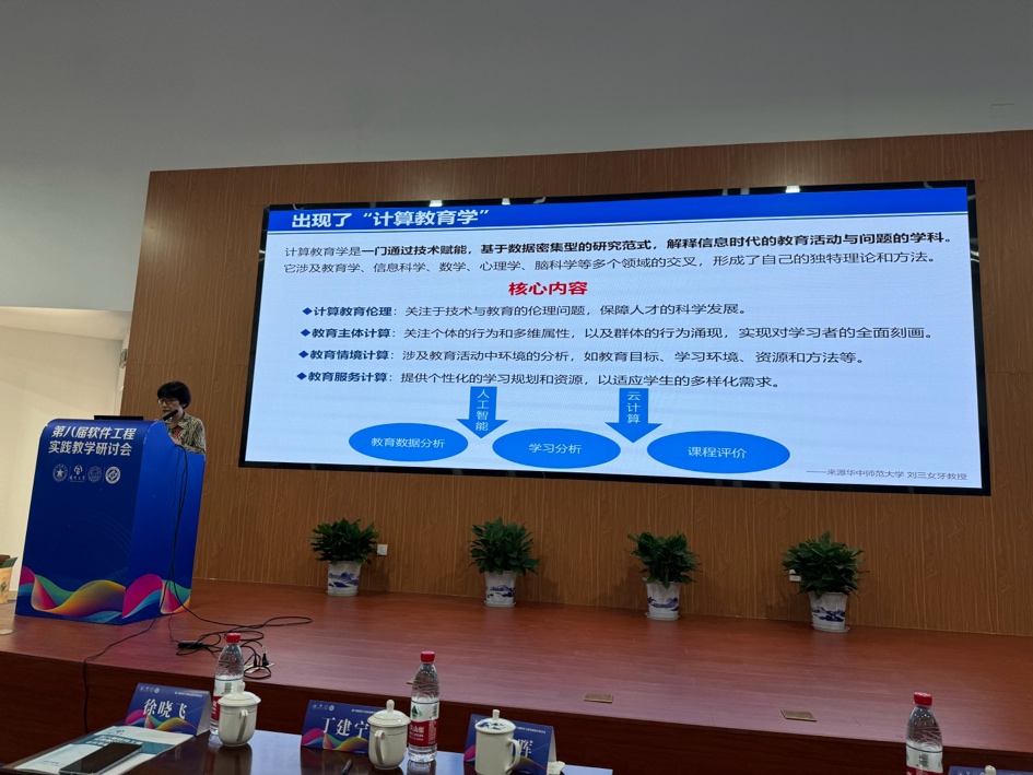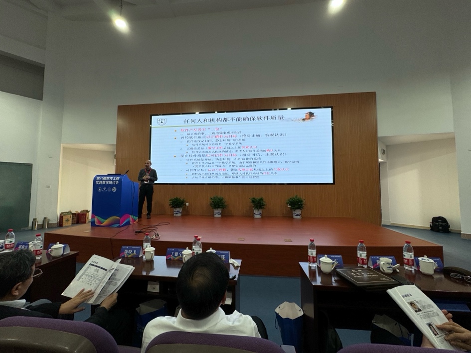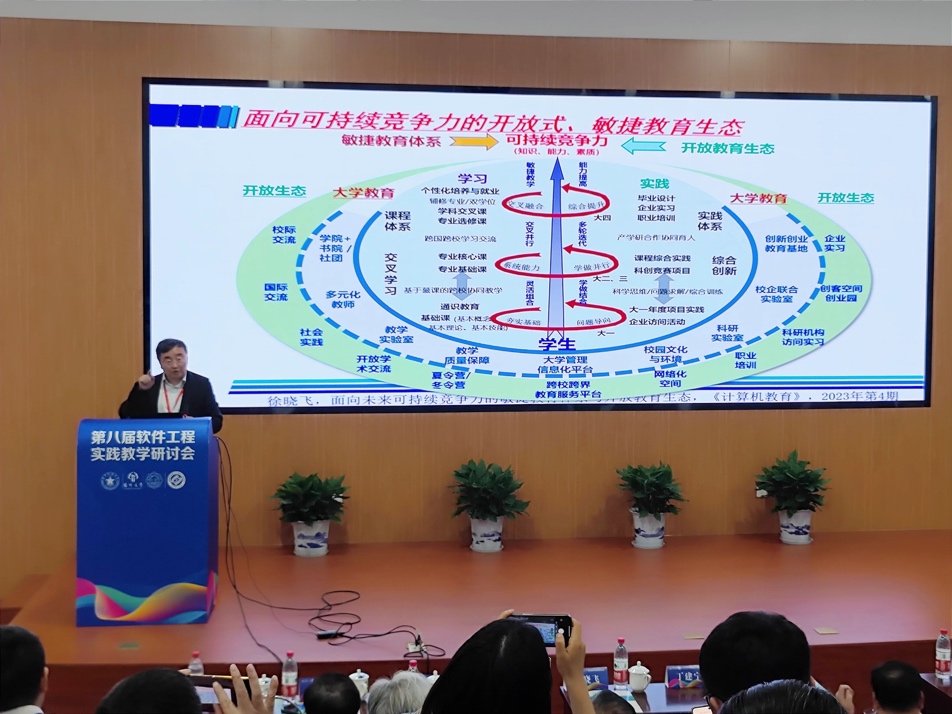 哈尔滨工业大学原副校长徐晓飞、南京大学教授李宣东、北京大学讲席教授胡振江、北京航空航天大学教授张莉、中航机载系统共性技术工程中心总经理牟明、国防科技大学教授毛新军等6位专家分别作特邀报告。徐晓飞教授以“软件工程专业与软件学院发展之路”为主题,报告了我国软件工程专业与示范性软件学院建设的经验进行回顾总结,提出面向可持续竞争力的敏捷教育及开放式教育生态体系。李宣东教授围绕大语言模型打开的解决问题空间和带来的可信保障挑战进行分析和阐述,探讨了具体的解决方案。胡振江教授全面介绍了教育部101计划的目标、规划、组织与实践情况,并对国内计算机学科的教育教学改革进行了展望。张莉教授分享了参与申请和评审国家自然科学基金“教育信息科学与技术领域(F0701)”项目的一些体会,将教学与科研的融合进行了很好示例。牟明研究员结合国内高等教育的现状,分析了高等教育与机载产业发展需求之间存在的矛盾,分析了需要解决的关键问题,并提出以产业为拉动的产学研用协同生态系统这一解决方案。毛新军教授介绍了学习和分析开源软件、基于开源软件来开展课程实践、借助群智知识来帮助学生解决学习问题、开展群体化学习等,分析了这些教育教学改革所带来的成效。