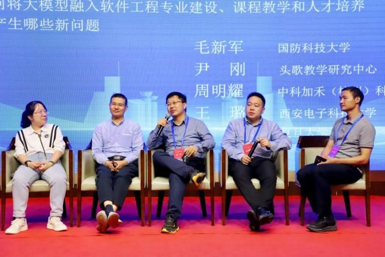 Panel讨论围绕“大模型时代社会和产业需要什么样的人才以及如何将大模型融入软件工程专业建设、课程教学和人才培养”主题邀请了国防科技大学毛新军教授、头歌教学研究中心尹刚博士、中科加禾科技有限公司周明耀副总裁、西安电子科技大学王璐副教授、复旦大学彭鑫教授等专家学者参加讨论,众多与会代表就各位专家的报告与观点进行了激烈的交流与讨论。