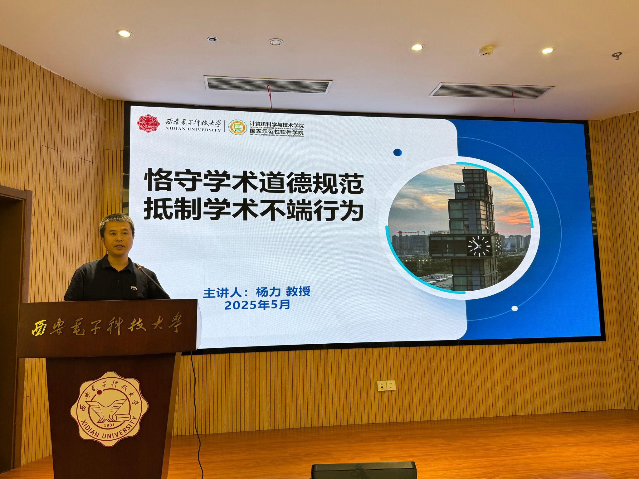 (通讯员 徐立)为大力弘扬科学家精神,增强学院研究生科研诚信意识,进一步推动学院科学道德与学风建设。5月15日下午,计算机科学与技术学院在南校区网安大楼A1-101开展“恪守学术道德规范,抵制学术不端行为”主题讲座,学院副院长杨力教授主讲,70余名研究生参加,会议由学院党委副书记王佩主持。