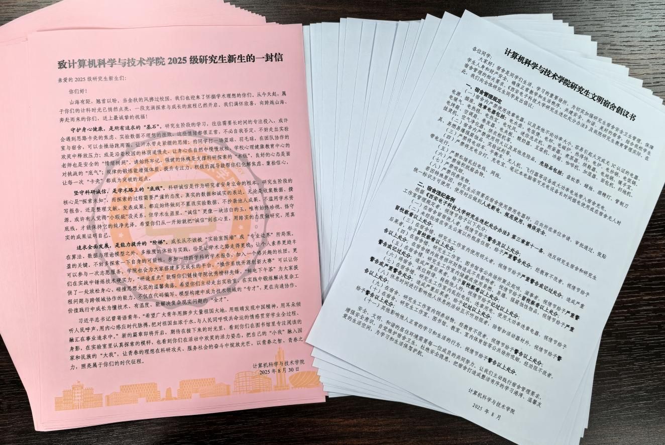 在用心打磨、精心制作后,学院为每位新生发放《致计算机科学与技术学院2025级研究生新生的一封信》,字里行间既包含对新生加入计科大家庭的欢迎,更围绕“如何度过有价值的研究生时光”展开深度引导,为研究生阶段的学习、科研与生活筑牢根基;学院现场组织新生学习《计算机科学与技术学院研究生文明宿舍倡议书》,志愿者通过案例教育、制度解读的方式,向新生重点强调宿舍用电安全、消防安全和卫生管理等方面的要求,让安全意识、文明意识从入学第一天便深植心间。