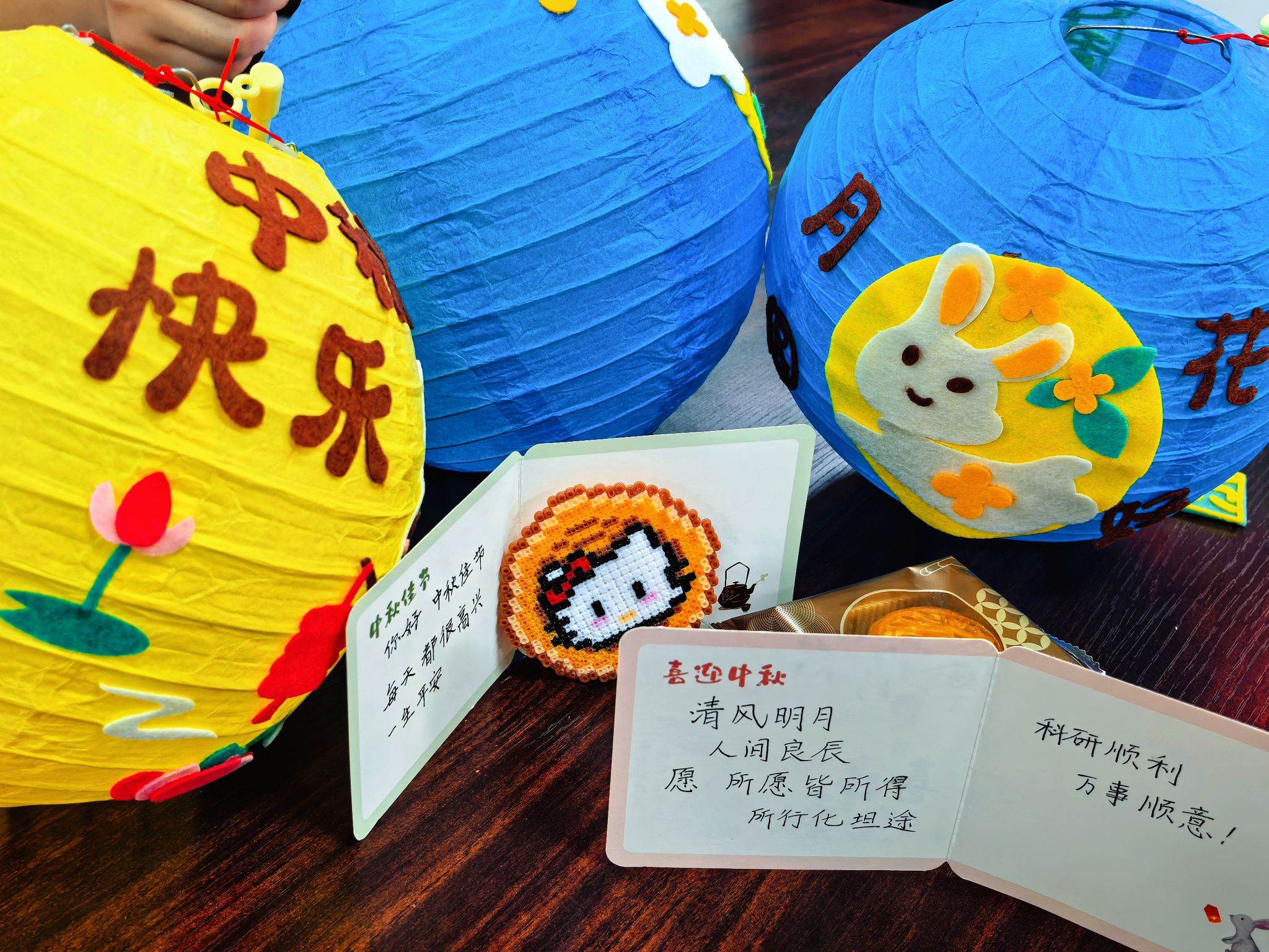 手工灯笼区则是一片专注与创意的天地。同学们充分发挥想象力与动手能力,有的同学在灯笼侧面写下“但愿人长久”的中秋诗句,有同学贴上玉兔的剪纸画。一个个独具特色的灯笼在手中逐渐成型,承载着对节日的美好期盼,整个手工灯笼区始终保持着专注有序的氛围,同学们在动手实践中感受传统节日的仪式感,也通过协作交流加深了彼此的互动,让中秋的美好期盼随着灯笼的成型愈发浓厚。