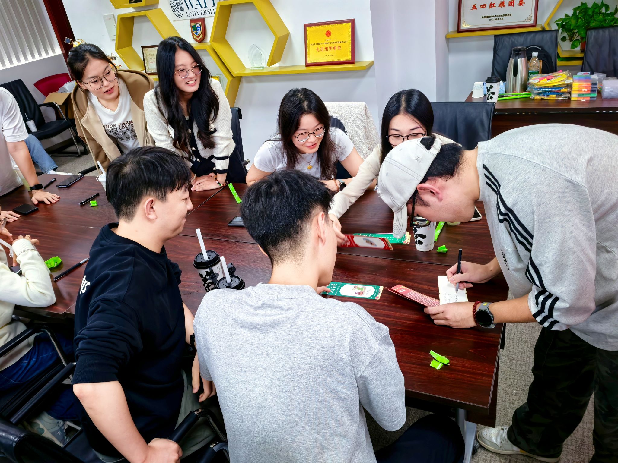 随着各体验环节渐入尾声,活动进入了“家乡中秋故事会”环节。同学们围坐在一起,分享各自家乡的中秋习俗与温情故事,不同地域的文化在这里碰撞出精彩火花,也让同学们在交流中更深刻地理解中秋“团圆”的文化内涵。随后,同学们依次从盲盒中抽取祝福卡片,当读到卡片上真挚的文字时,现场不时响起阵阵笑声与掌声。“愿你科研顺利,中秋快乐”“希望这个中秋,我们都能收获满满温暖”,简单的话语传递着同窗情谊。
