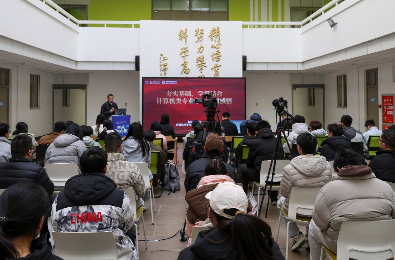 12月25日下午,计算机科学与技术学院执行院长崔江涛以《夯实基础,学用结合——计算机类学业规划感悟》为题,结合自身求学经历与成长故事,为2025级新生讲授未来航向课,勉励新生筑牢专业基础、树立科研报国志向。报告在海棠5号楼书院文化大厅举行,并通过“学在西电”平台同步直播,计科院分管学生工作的负责同志、计算机类辅导员、新生书院办公室相关同志和六百余名计算机类新生参与活动。