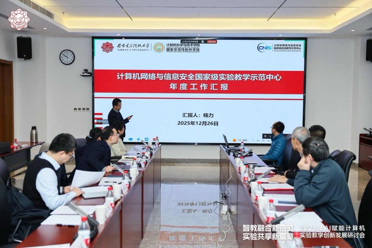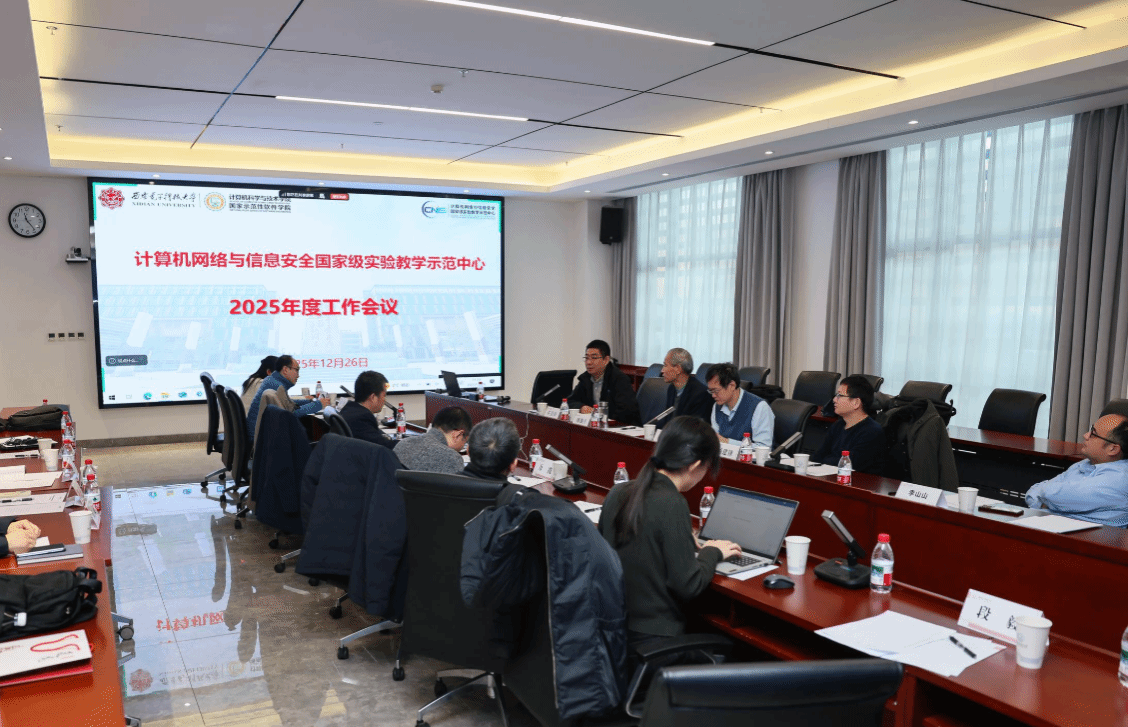 12月26日上午,“计算机网络与信息安全国家级实验教学示范中心2025年度工作会议”在南校区会议中心A121会议室举行。国家级教学名师、西安交通大学桂小林教授,国家级教学名师、陕西师范大学傅钢善教授,西北大学信息科学与技术学院副院长冯筠教授、实验中心主任杨建锋高级工程师,华为高校系统部鲁月华主任,西电教务处副处长兼教师教学发展中心办公室主任杨明磊,电子工程学院副院长任爱锋,计算机科学与技术学院副院长万波、本科教学办公室主任张亚菲及实验教学中心教师代表,共计20余人参加会议。会议由学院副院长兼国家级实验教学中心主任杨力主持。