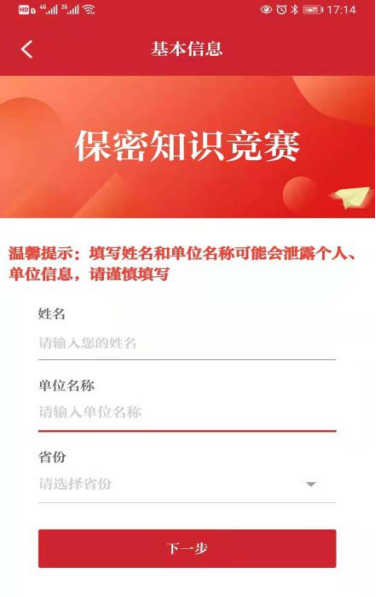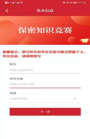 2.点击考试栏目,进入考试界面,填写“姓名”“单位名称”,选择“省份”,点击“下一步”开始考试。(姓名可填昵称,单位名称请填写:西安电子科技大学计算机科学与技术学院)。