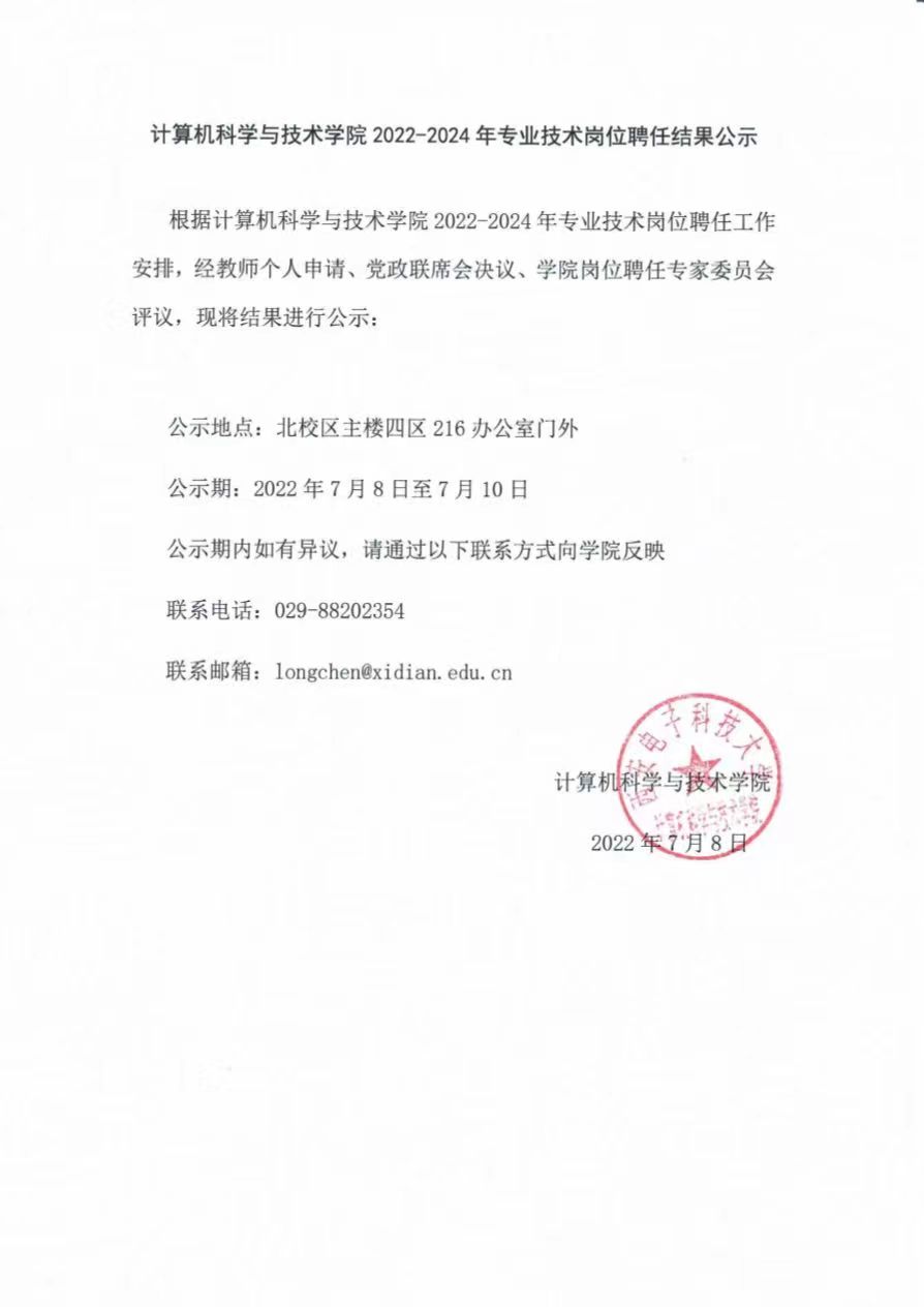 计算机科学与技术学院2022-2024年专业技术岗位聘任结果公示