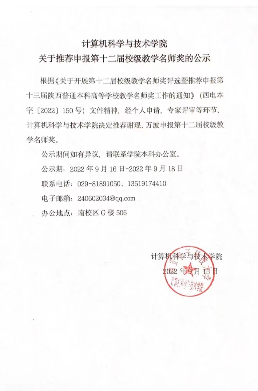 计算机科学与技术学院关于推荐申报第十二届校级教学名师奖的公示