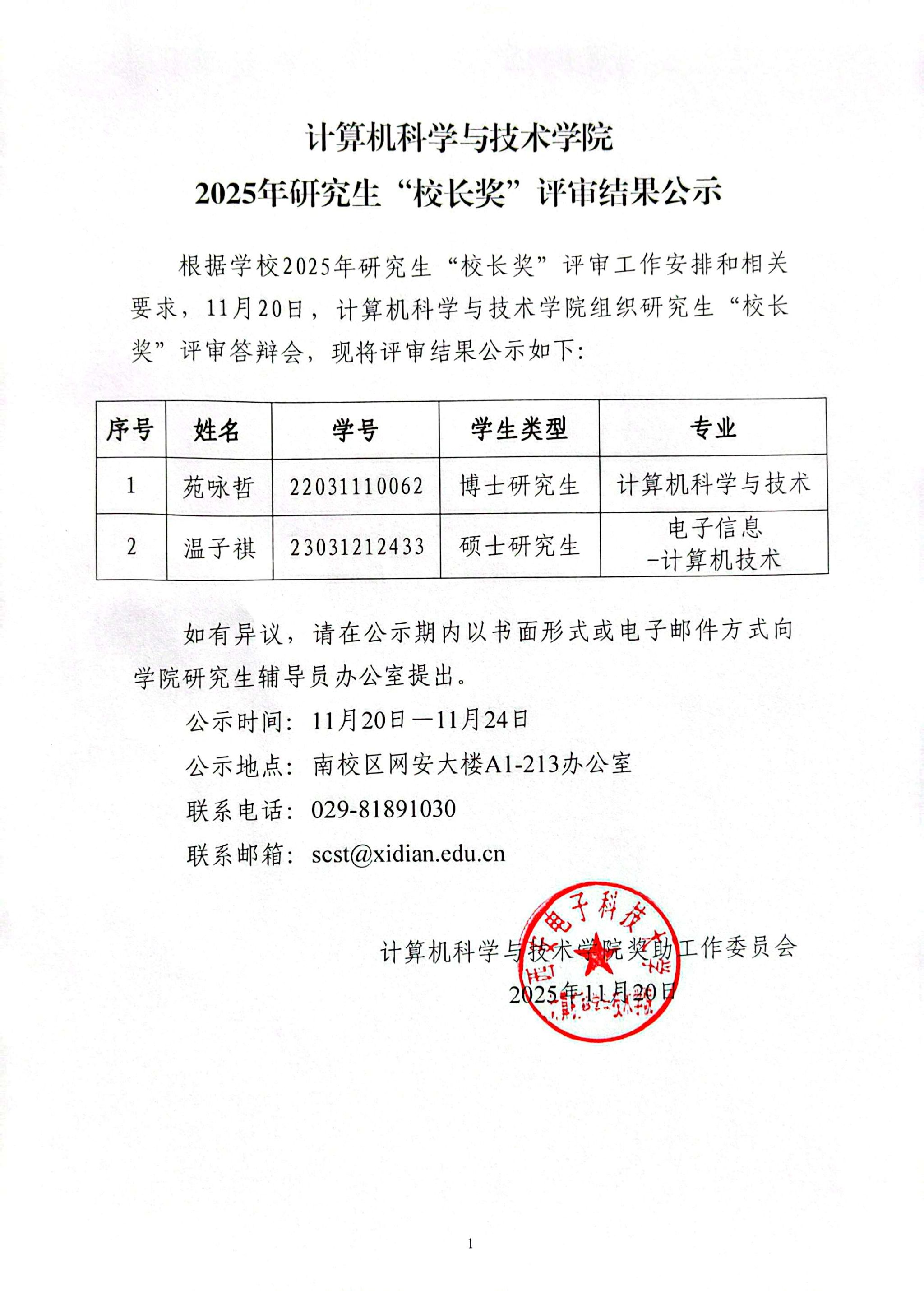 计算机科学与技术学院2025年研究生“校长奖”评审结果公示