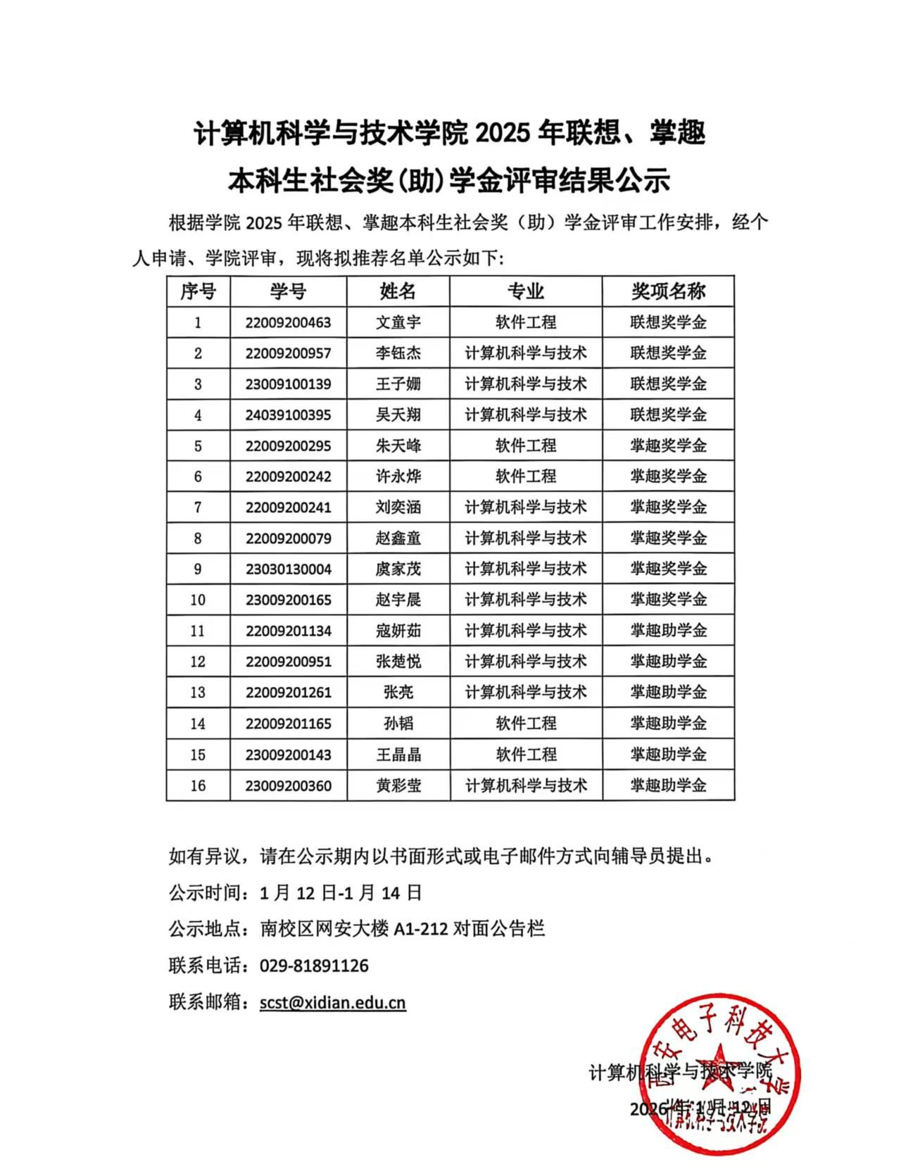 计算机科学与技术学院2025年联想、掌趣本科生社会奖(助)学金评审结果公示