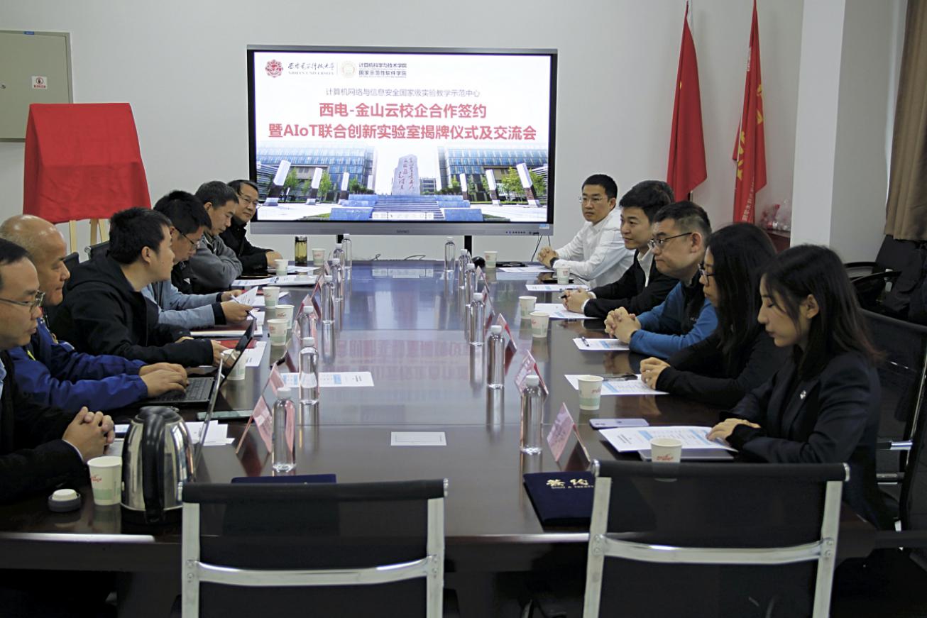 (通讯员 段毅 黄伯虎)11月19日上午,计算机网络与信息安全国家级实验教学示范中心与来访的北京金山云网络技术有限公司在新区E楼III-212会议室举行了“西电-金山云校企合作签约暨AIoT联合创新实验室揭牌仪式”系列活动。参会代表有金山云总经理殷帅、AI首席算法架构师苏驰、高级总监赵勇、高级技术经理丁明辉、项目经理刘不凡和高级商务经理陈晓萌等,学校及实验中心参会代表有信息资源中心主任张国良、学院本科教学负责人万波、国家级实验示范中心杨力、网络工程系主任权义宁,实验示范中心副主任贾文、王宗武和黄伯虎及骨干教师代表。