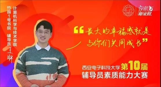 4月23日下午,西安电子科技大学第十届辅导员素质能力大赛在行政楼210报告厅落下帷幕。历时5个月的比拼,来自通信工程、电子工程、计算机科学与技术等9个学院9名辅导员进入决赛,他们作为辅导员代表,通过“以赛代练、以赛促学”的形式在赛场上展示工作案例、交流工作经验。经过两轮激烈的比拼,我院2020级辅导员王牌以总分89.37分荣获我校第十届辅导员素质能力大赛一等奖。