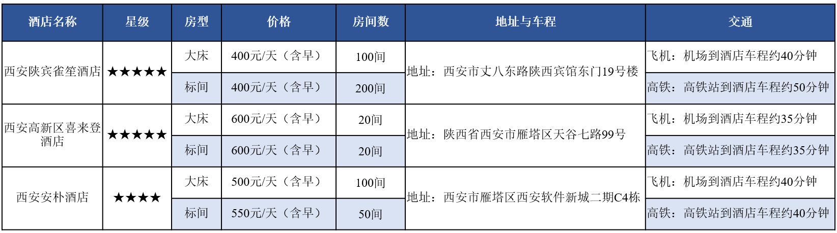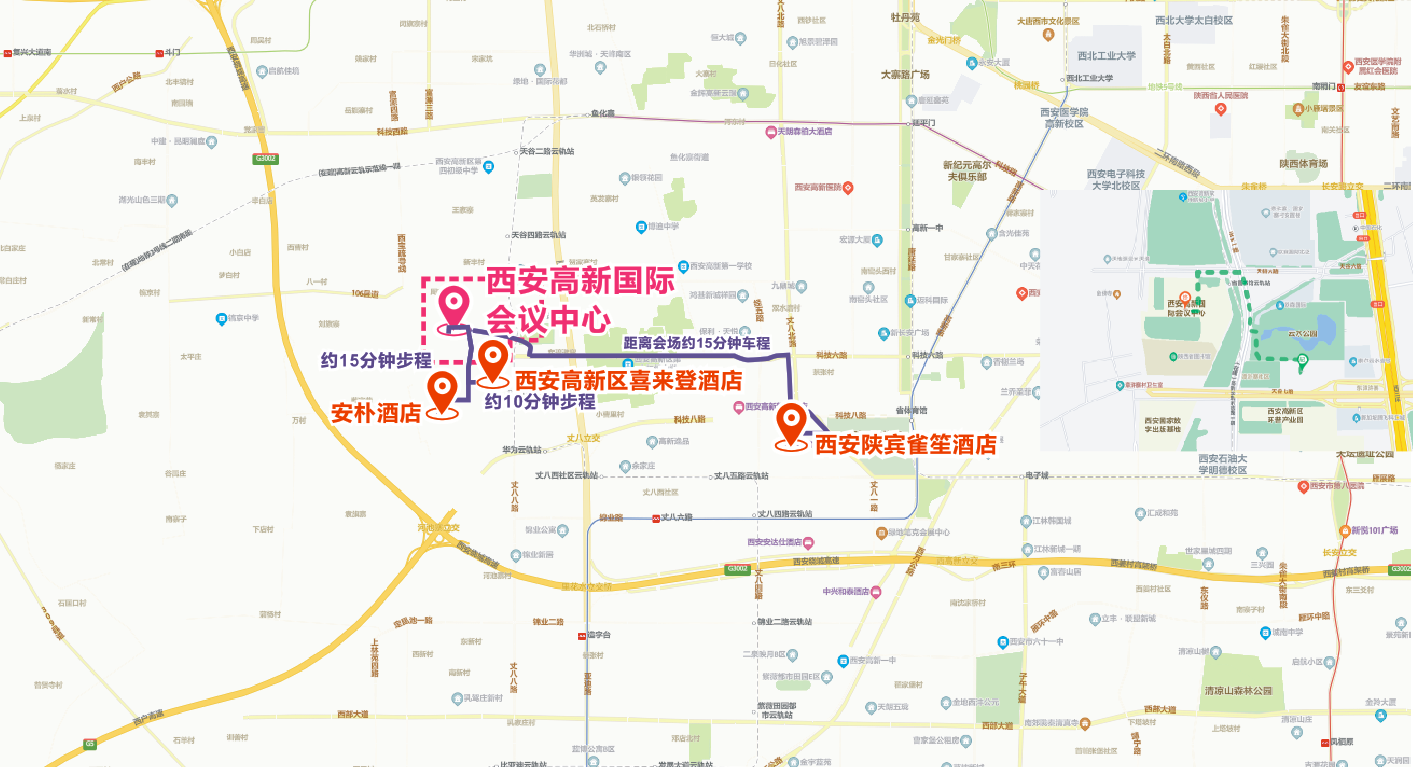 本次大会所推荐酒店,陕西宾馆雀笙酒店与安朴酒店都将由会务组提供酒店至会场的摆渡车服务,陕西宾馆雀笙酒店距离本次会议的举办地西安高新国际会议中心约15分钟车程,安朴酒店距离西安高新国际会议中心约5分钟车程。西安高新区喜来登酒店距离西安高新国际会议中心步行约10分钟。酒店预订链接:http://kaili.kailimice.cn/f/WuTdwF