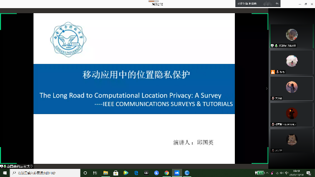 博士研究生刘灵通同学以数据流处理为主题,具体介绍了一种符合Turnstile模型的分布式数据流的测量算法。博士研究生邱国英同学以生活中的移动应用作为切入点,展示了位置隐私保护的典型应用场景,介绍了隐私安全威胁与挑战和隐私保护关键技术等。硕士研究生何明扬同学从国家对物联网的战略需求出发,介绍了团队自主研究开发的MicroThings微物联共享开放平台,解释了“1+2+N”的物联网平台设计理念。在问答环节,线上线下的听众积极提问,与报告人开展了积极有效的互动交流。