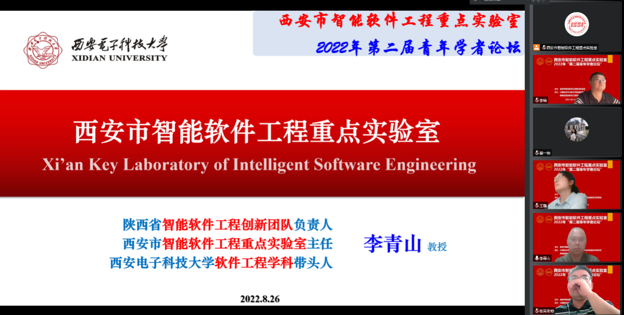 (通讯员 崔笛)2022年8月25日至8月26日,西安电子科技大学西安市智能软件工程重点实验室第二届青年学者论坛成功举办。本次论坛由计算机科学与技术学院智能软件与系统技术研究所与陕西省智能软件工程科技创新团队承办,采用线上方式进行。论坛围绕软件工程学科相关领域最新学术进展,邀请了北京大学、清华大学、南京大学、复旦大学、中国人民大学、香港大学、南方科技大学、南开大学、南京航天航空大学、西北工业大学、西安电子科技大学、美国芝加哥大学、德国慕尼黑工业大学、澳大利亚莫纳什大学、加拿大阿尔伯塔大学、新加坡管理大学等国内外软件工程学科优势高校的软件工程相关领域优秀青年学者,通过主题报告、交流沙龙等形式,分享了智能软件与智能系统领域的理论与技术新进展,讨论了相关领域的学术前沿,并就我校软件工程学科的建设与青年教师成长等问题进行了交流研讨。论坛吸引了国内外软件工程相关领域师生与从业人员的广泛参与,同时在线人数超过500人。