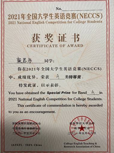 (通讯员 何敏之)5月16日,经过激烈的角逐,在2021年全国大学生英语竞赛(NECCS)陕西赛区复赛中,西安电子科技大学计算机科学与技术学院2020级硕士研究生颜思彤脱颖而出,斩获A类特等奖,她也是全校唯一在复赛中取得A类特等奖的研究生。此外,全校共有九位同学获得该竞赛陕西赛区特等奖的优异成绩。