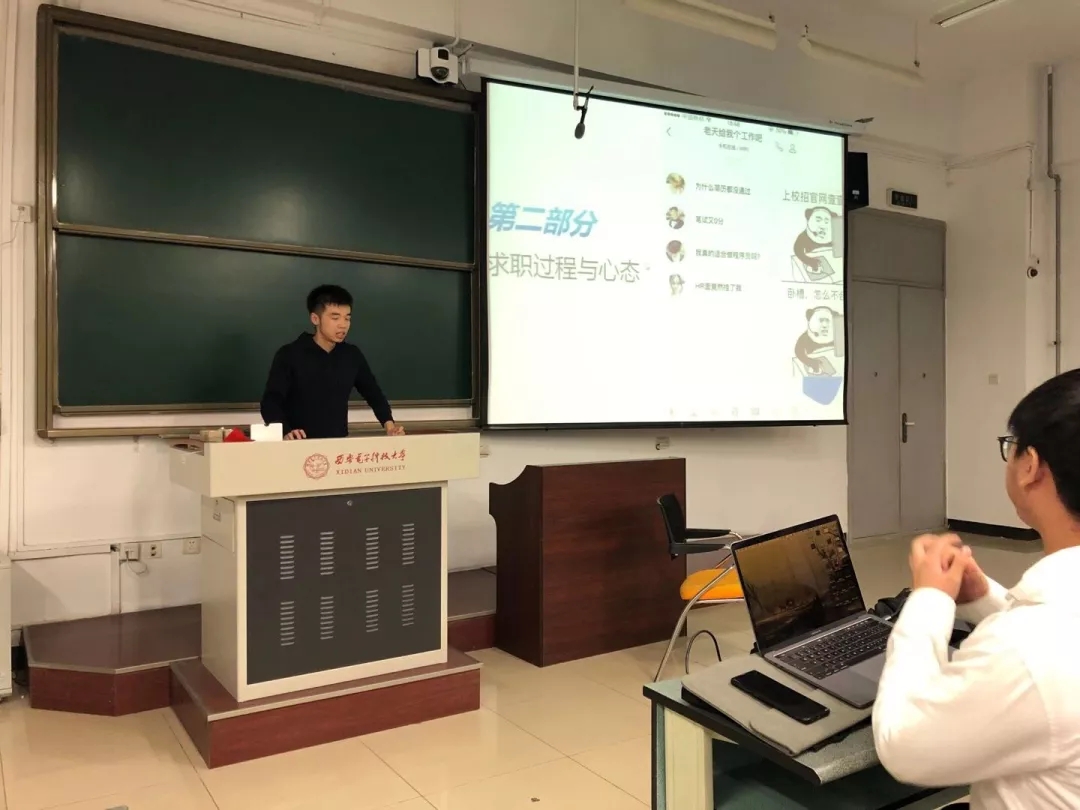 交流会第二环节,学院请到17级offer大神滕野、马博群、赵奉辰三位同学为大家分享求职经验,并邀请通过考研成功上岸的20级学长李久同、刘森、何封为同学们带来考研经验分享。