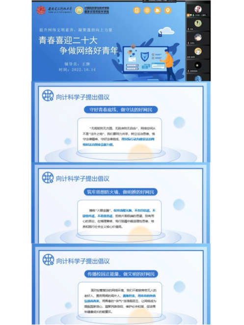 为进一步增强大学生网络文明素养,近日学院“计科青马”班举办了“青春喜迎二十大,争做网络好青年”专题讲座,并向广大学子发起文明上网的倡议书。同学们纷纷表示,作为一名在校大学生,应当不断提高网络文明素养,自觉抵制网络谣言和网上不法行为,共同弘扬新风正气,共建共享清朗的网络空间。学院结合晚点名、主题团课等不断深化网络文明教育,努力营造积极向上的校园网络文化氛围,迎接党的二十大胜利召开。