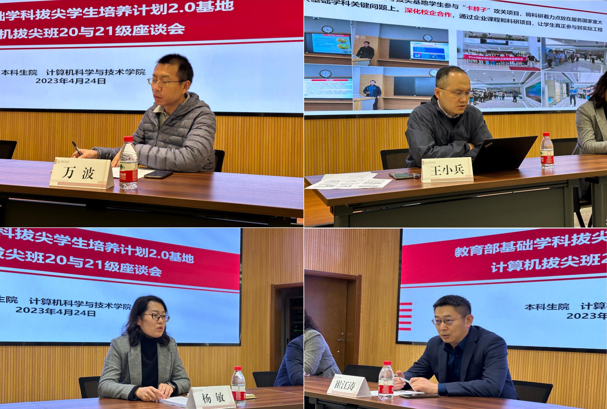座谈会由计算机科学与技术学院副院长万波主持。计算机拔尖班负责人王小兵首先介绍了近年来拔尖班在培养体系、科研实践、课程建设、分流机制、文化活动等方面的进展。本科生院副处长杨敏介绍了学校对拔尖班在专项经费、师资力量、课程建设、国际交流等方面的政策支持。计算机科学与技术学院执行院长崔江涛介绍了拔尖班的目标定位、能力要求、学科特色、保障体系,并从服务国家重大需求方面阐述了计算机拔尖班肩负的责任,引导学生胸怀远大,树立成为未来战略科学家的志向。