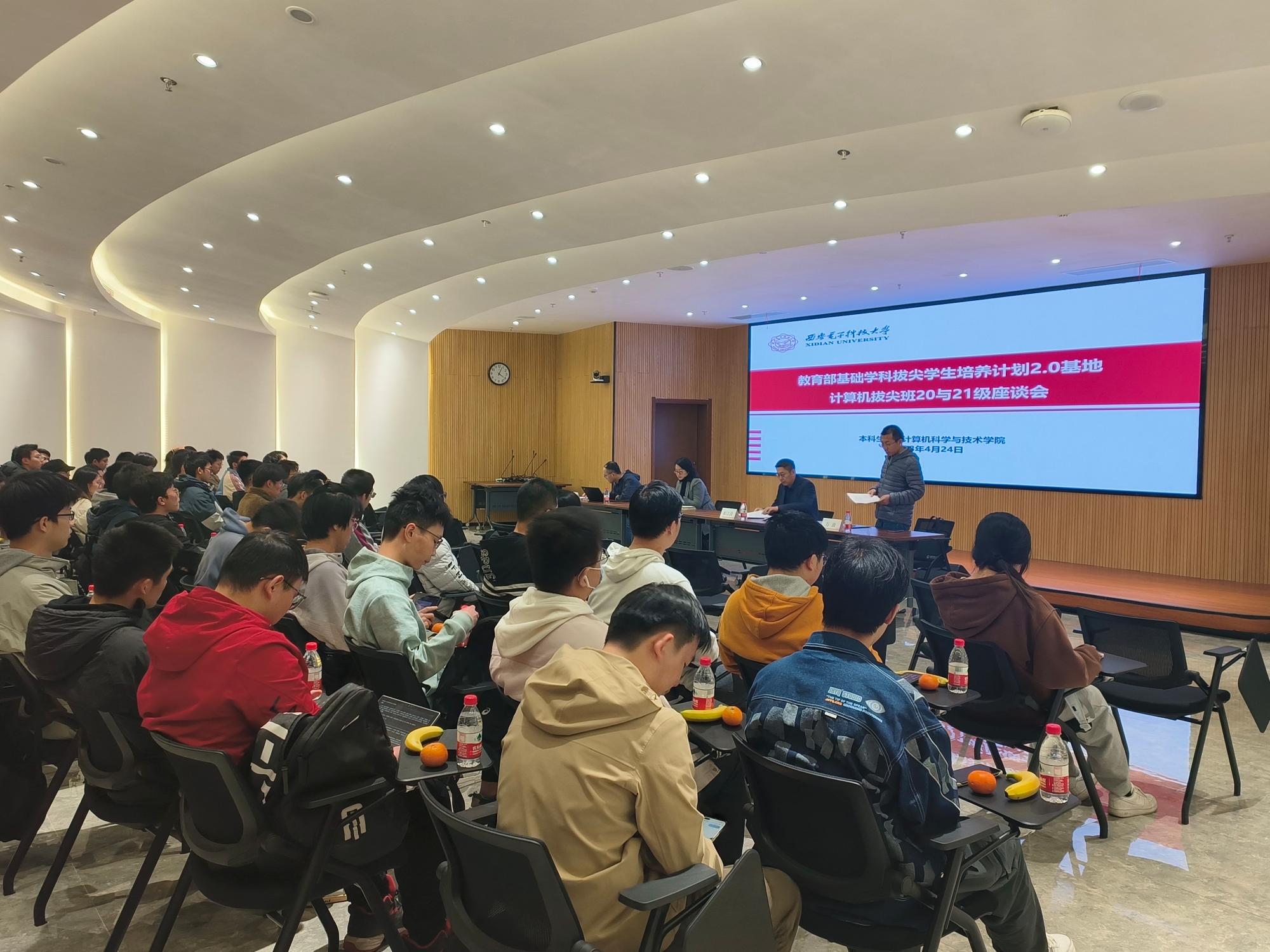 (通讯员 王小兵)为贯彻落实“全面提高人才自主培养质量,着力造就拔尖创新人才”二十大精神,根据学校第十三次党代会拔尖创新人才培养工作部署,4月24日下午4点,计算机拔尖班2020级与2021级学生座谈会在南校区网安大楼会议中心103报告厅召开。本科生院副处长杨敏,计算机科学与技术学院执行院长崔江涛,副院长万波,计算机拔尖班负责人王小兵参加。本次座谈会由计算机科学与技术学院与本科生院共同举办,旨在深入调研拔尖班特性需求,全面落实立德树人根本任务,推进学校拔尖创新人才培养工作,提高人才自主培养质量,打造“不设天花板”的拔尖人才培养空间。