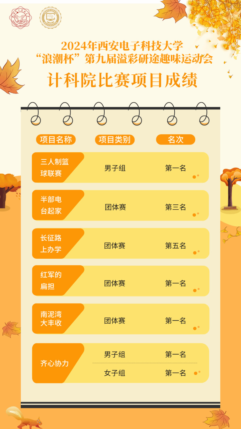 (通讯员 雷泽宇 寇大为)叶黄金满地,终南秋意浓。10月20日,“浪潮杯”2024年西安电子科技大学第九届研究生趣味运动会在南校区如期举行。学院提前谋划,精心组织。师生团结努力,奋勇拼搏,最终以112分总成绩拔得头筹,继计科院2023年获得该项赛事第一名之后,再次取得“团体总分第一名”好成绩!