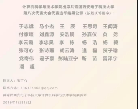 2019年12月12日中午,计算机科学与技术学院关于选举出席共青团西安电子科技大学委员会第八次代表大会会议于B314教室胜利召开。校团委副书记于志斌,计算机科学与技术学院团委书记潘超,计算机科学与技术学院团委副书记李栋出席此次会议,会议由计算机科学与技术学院团委副书记雷泽宇主持。