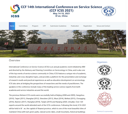 中国计算机学会第14届服务科学国际会议(CCF 14th International Conference on Service Science)将于2021年5月14日~16日在西安举行。本次会议由中国计算机学会服务计算专委会主办,西安电子科技大学计算机科学与技术学院承办。本次会议也是西安电子科技大学软件工程学科2021年举办的学术活动之一。