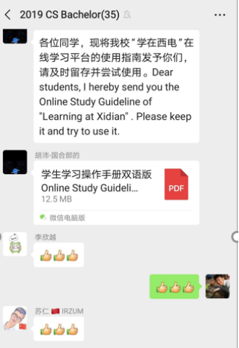 全面梳理,重点关注。目前计算机科学与技术专业2019级留学生共有24人,分布在9个国家,面对疫情特殊时期以及留学生回国问题,会同国合部第一时间发送了线上学习情况的调查问卷,调研学生们所处的位置状态、进行线上学习的设备情况以及学生所处地区的时差等问题。获知8个学生在国外的消息后,仔细询问每个学生的情况,了解他们的想法,打消他们的担忧。建立全体任课教师和留学生的微信群,提前公布中英文课表,发布学在西电平台使用手册英文版,及时解答学生提出的各类问题。