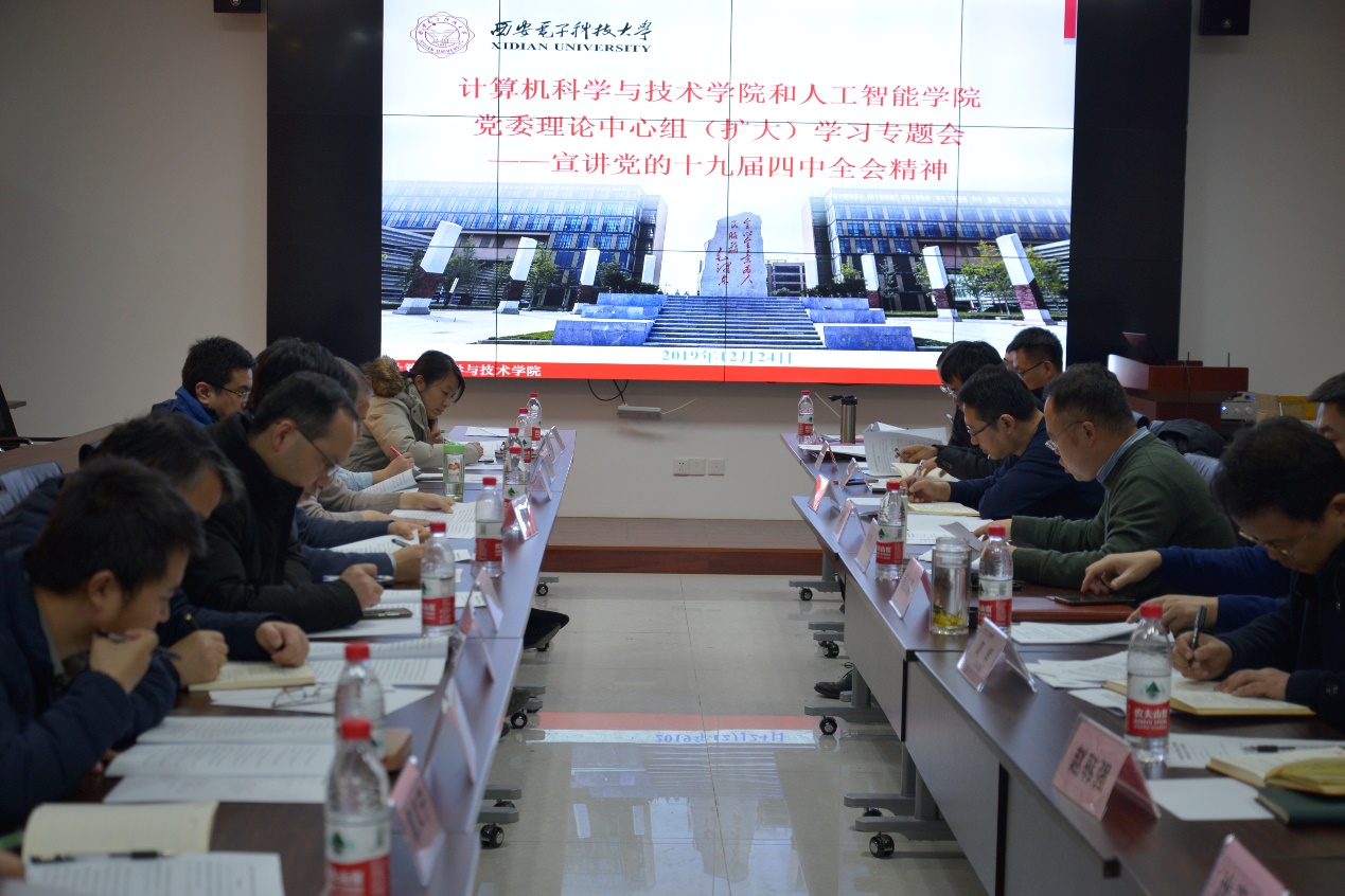 (通讯员 同榛)12月24日下午,计算机科学与技术学院和人工智能学院党委在北校区主楼二区319会议室召开理论中心组(扩大)学习会议,专题宣讲党的十九届四中全会精神。计算机科学与技术学院和人工智能学院党政班子成员参加了集体学习,两学院两委委员、教职工党支部书记、基层系所负责人等列席会议。会议由人工智能学院党委书记魏峻主持。