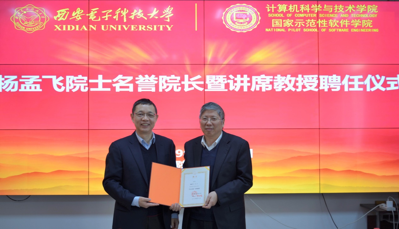 (通讯员 陈龙)12月21日上午,西安电子科技大学计算机科学与技术学院名誉院长杨孟飞院士“华山学者”讲席教授及战略咨询委员会委员聘任仪式在北校区主楼Ⅱ区319会议室举行,校长杨宗凯、副校长王泉出席仪式。仪式由计科院执行院长崔江涛主持。