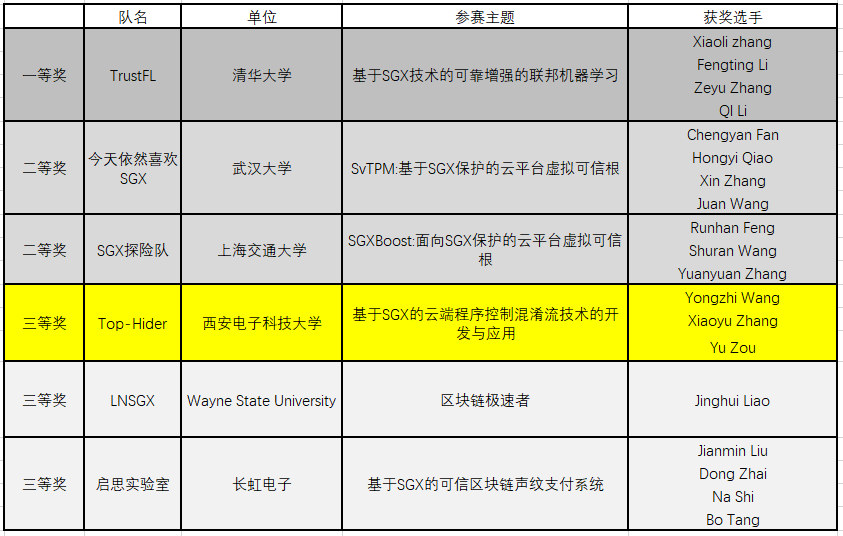 本次参赛作品基于王永智副教授发表在CCF A 类会议INFOCOM 2019的论文 CFHider: Control Flow Obfuscation with Intel SGX,提出了SGX的云端程序控制混淆流加密的方案,实现了在不可信的公共云环境下程序控的机密性保护,使得攻击者无法获取用户的程序控制流(算法),保障了公共云上的程序的知识产权安全。与现有的基于软件的解决方案相比,此方案在通用性和性能方面更有优势,并且具有可验证的安全性保证。此方案得到了大赛评委团的一致认可,同时也为云上代码的知识产权保护提供了新的思路。