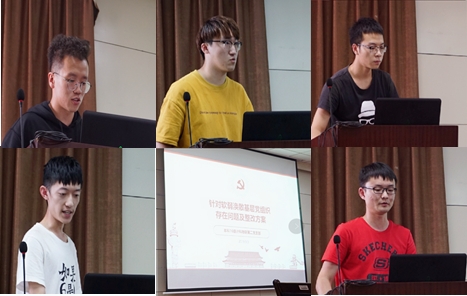 接着,本科2016级计科物联第二党支部支委班子5人依次汇报了支部党建工作自查情况。支委班子分别结合工作职责、分工进展等剖析党支部现存主要问题,一是支委班子履职能力较差,主要体现在支委班子经验欠缺、责任意识较弱、组织纪律性不强等方面;二是支部党员参与程度不够,主要体现在重视程度不高、对党支部活动关注度低和活动时间难以协调等方面。以此为基础,设计了逐月工作计划和安排,并从支委班子分工角度谈了改进工作作风、增强支委班子凝聚力的具体举措。