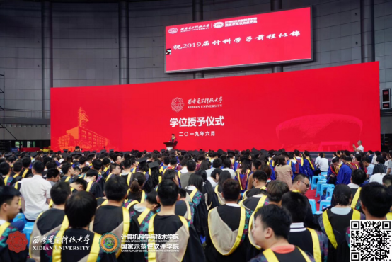 2019年6月21日下午13:00,计算机科学与技术学院在南校区远望谷体育馆隆重举行2019届毕业生学位授予仪式。参加学位授予仪式的有西安电子科技大学校长助理王泉教授,计算机科学与技术学院执行院长、学位评定委员会主任崔江涛教授,计算机科学与技术学院党委书记、学位评定委员会副主任李青山教授,计算机科学与技术学院副院长、学位评定委员会委员田聪、沈玉龙、苗启广教授,计算机科学与技术学院学位评定委员会委员宋胜利教授,计算机科学与技术学院党委副书记张莹莹,导师代表付少锋、蔺一帅,研究生及本科生毕业班辅导员,2019届全体本科毕业生940余人、研究生毕业生400余人,以及部分学生家属。会议由院党委书记李青山教授主持。