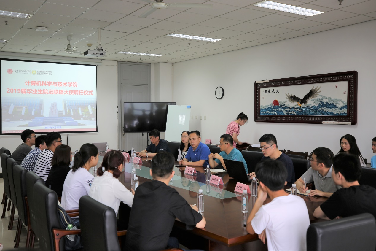 (通讯员 卫萌)2019年6月11日下午3点,计算机科学与技术学院院友联络大使聘任仪式在南校区G514会议室举行。学院党委书记李青山、党委副书记张莹莹、2019届毕业生辅导员、2019届毕业生院友联络大使出席聘任仪式,聘任仪式由李青山主持。