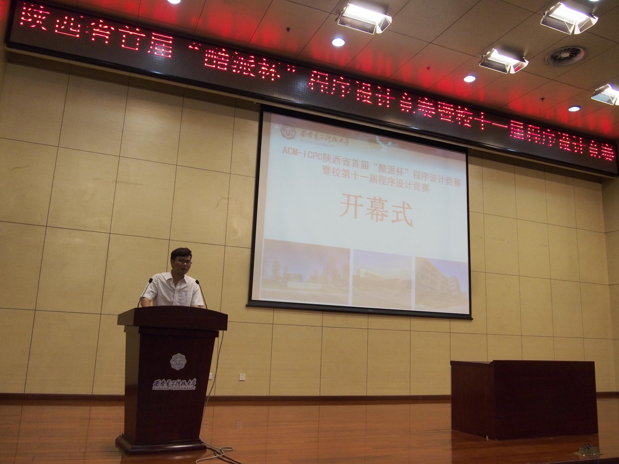 开幕式上,黄大林代表比赛主办方致欢迎辞,他首先对比赛的举办表示祝贺,对省内各地兄弟院校选手的到来表示欢迎,同时介绍了西安电子科技大学近年来在ACM比赛领域取得的成绩和贡献,他希望把此次比赛办成一个交流学习的开放平台,最后,他祝愿比赛顺利进行,参赛选手赛出风格、赛出水平,在公平公正的环境下取得优异成绩。