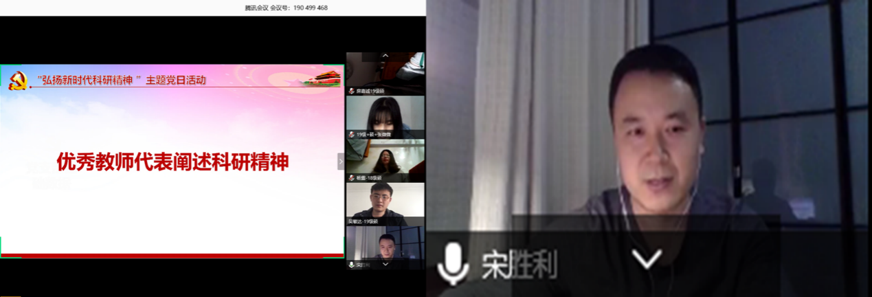 软件工程系主任、软件工程系党支部书记宋胜利老师谈到,作为一名教师、作为一名党员,在合适的时间,利用自己的特长发挥自己的作用,为疫情防控做一些贡献,这是一件光荣的事情。随后,宋老师就科研精神在多个维度展开分享交流。首先,宋老师提醒各位党员要深刻理解科学研究的本质和内涵是要不断探索、追求新知,将自己的科研能力服务于国家经济社会发展。其次,宋老师分享了关于科学研究的三个层次:第一个层次是基础研究,主要注重于新理论和新原理的探讨;第二个层次是应用研究,将在应用研究中获得的技术方案运用到解决实际问题中;第三个层面是开发研究,将在应用研究中已获取的实际技术方案运用到问题的解决中。最后,宋老师以计算机和软件相关专业为背景,阐述了科学研究的三个层次如何与每位党员的实际科研工作相结合,取得更好的科研成果。