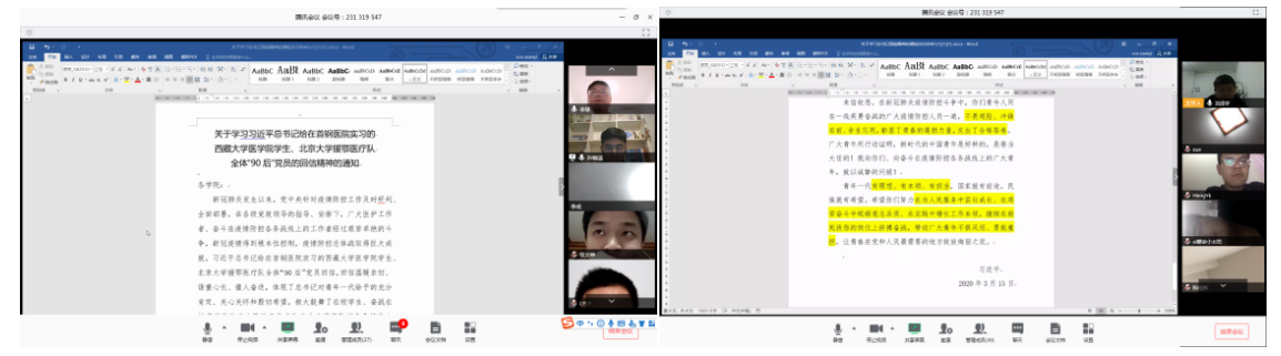 (通讯员 刘泽宇 孙煊溢)新冠肺炎疫情爆发以来,广大医护工作者、奋斗在疫情防控各条战线上的工作者披荆斩棘、勇挑重担,为坚持打赢疫情防控总体战不遗余力。3月15日,习近平总书记给在首钢医院实习的西藏大学医学院学生、北京大学援鄂医疗队全体“90后”党员回信,向他们和奋斗在疫情防控各条战线上的广大青年,致以诚挚的问候。回信在广大青年学生,特别是学生党员中引起热烈反响。4月3日晚上7点30分,计算机科学与技术学院硕士031712班第一、二党支部通过线上会议方式举办了“青年不惧风雨、抗疫勇挑重担”主题党日活动,认真学习习近平总书记回信精神,并开展热烈讨论。