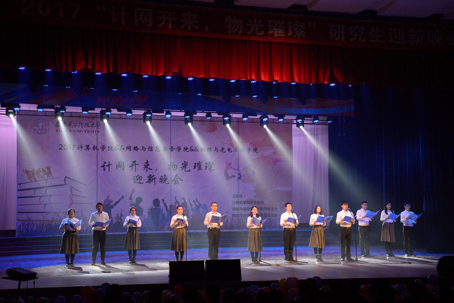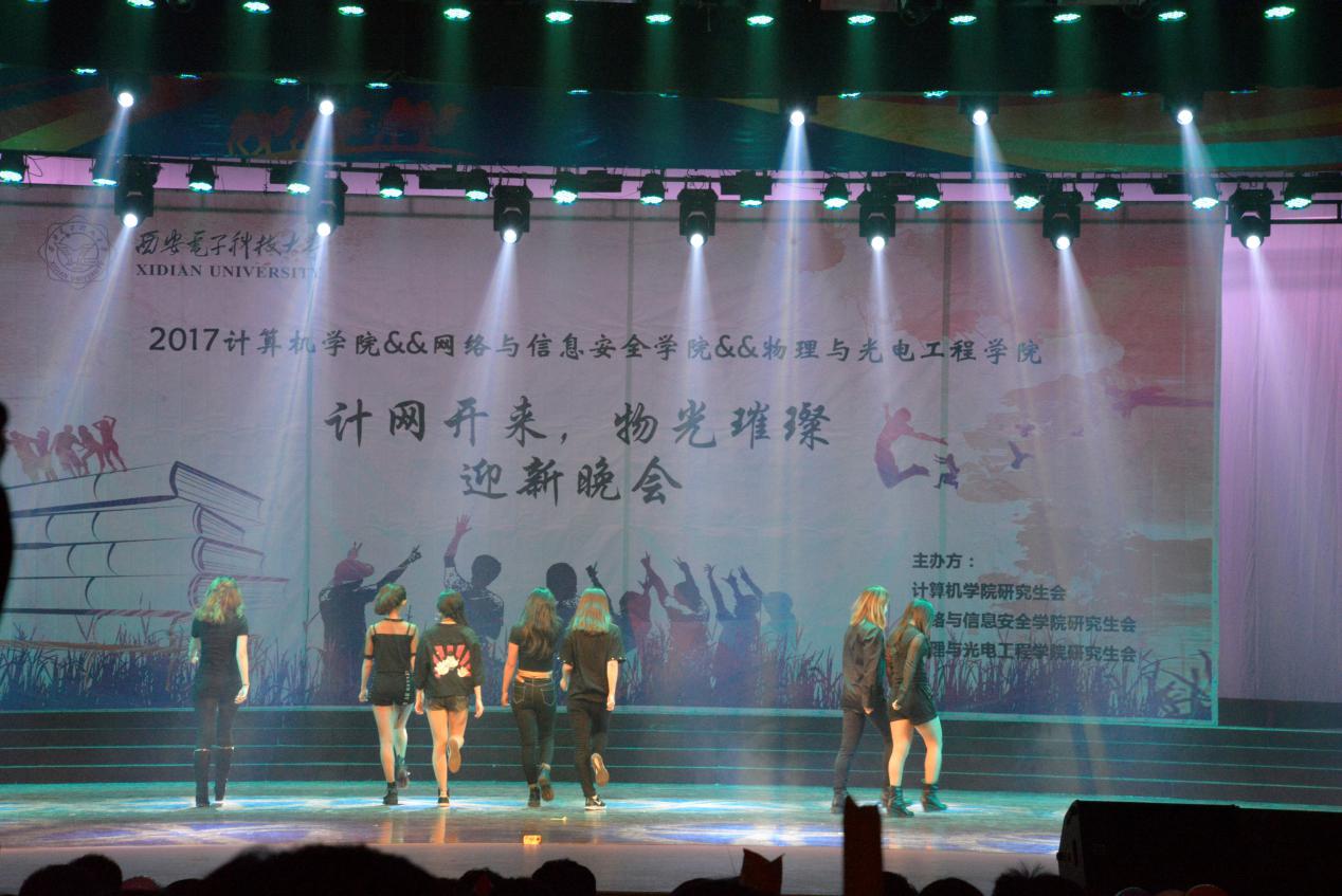 11月16日晚,计算机、网络与信息安全、物理与光电工程三个学院联合举办了“计网开来,物光璀璨”迎新晚会。计算机学院院长王泉、党委副书记党文学、副院长王卫东,网络与信息安全学院党委副书记张美茹,物理与光电工程学院党委书记杨光暐、党委副书记 林波,计算机学院研究生辅导员张尚伟,网络与信息安全学院研究生辅导员陈强出席晚会,与同学们一起观看了演出。