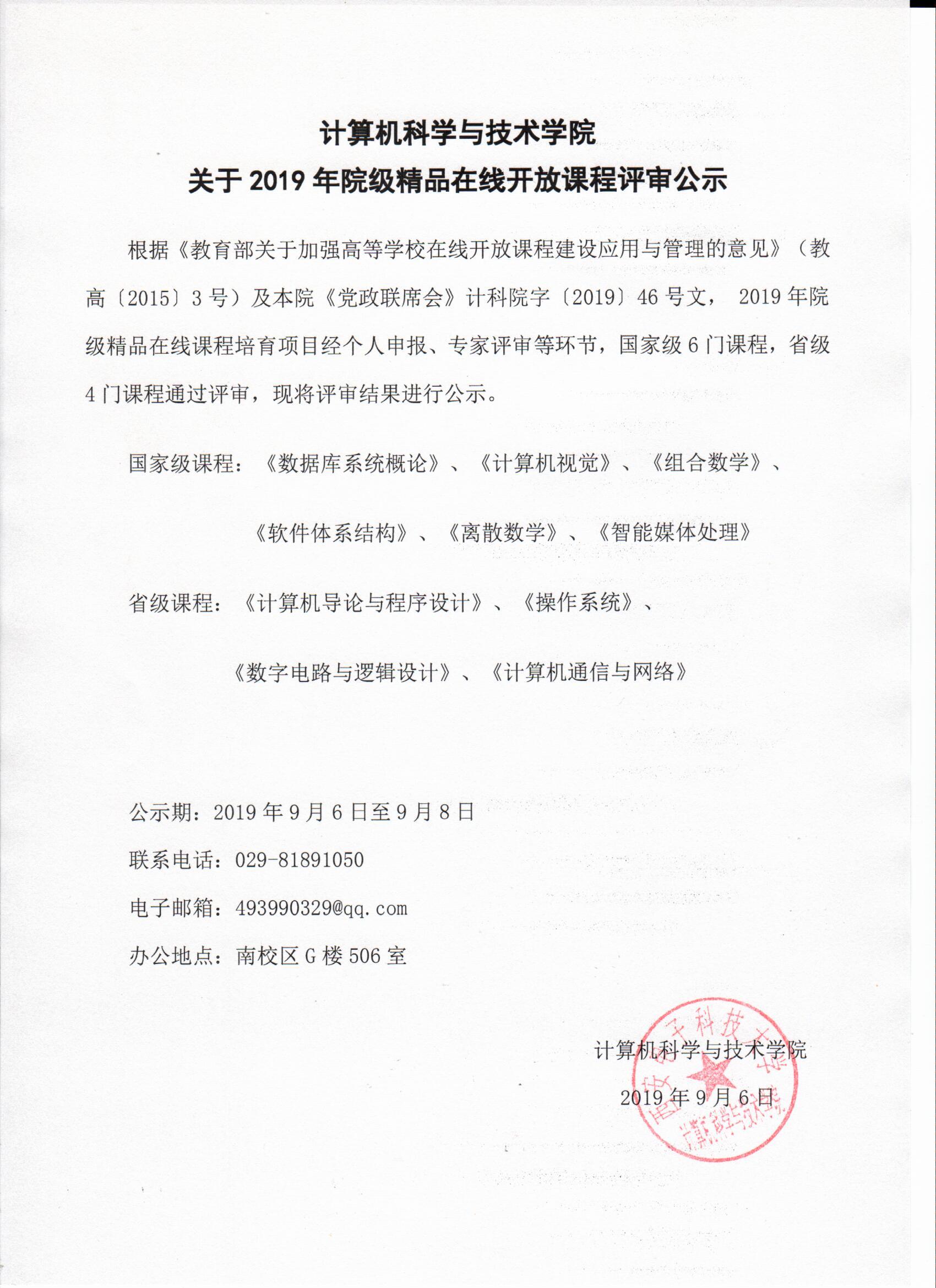 计算机科学与技术学院关于2019年院级精品在线开放课程评审公示