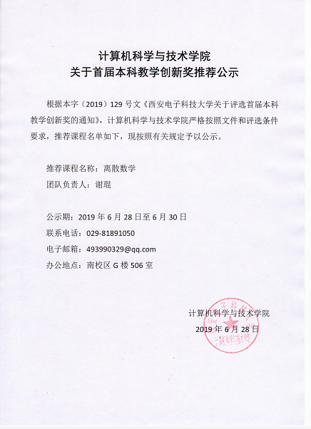 计算机科学与技术学院关于首届本科教学创新奖推荐公示