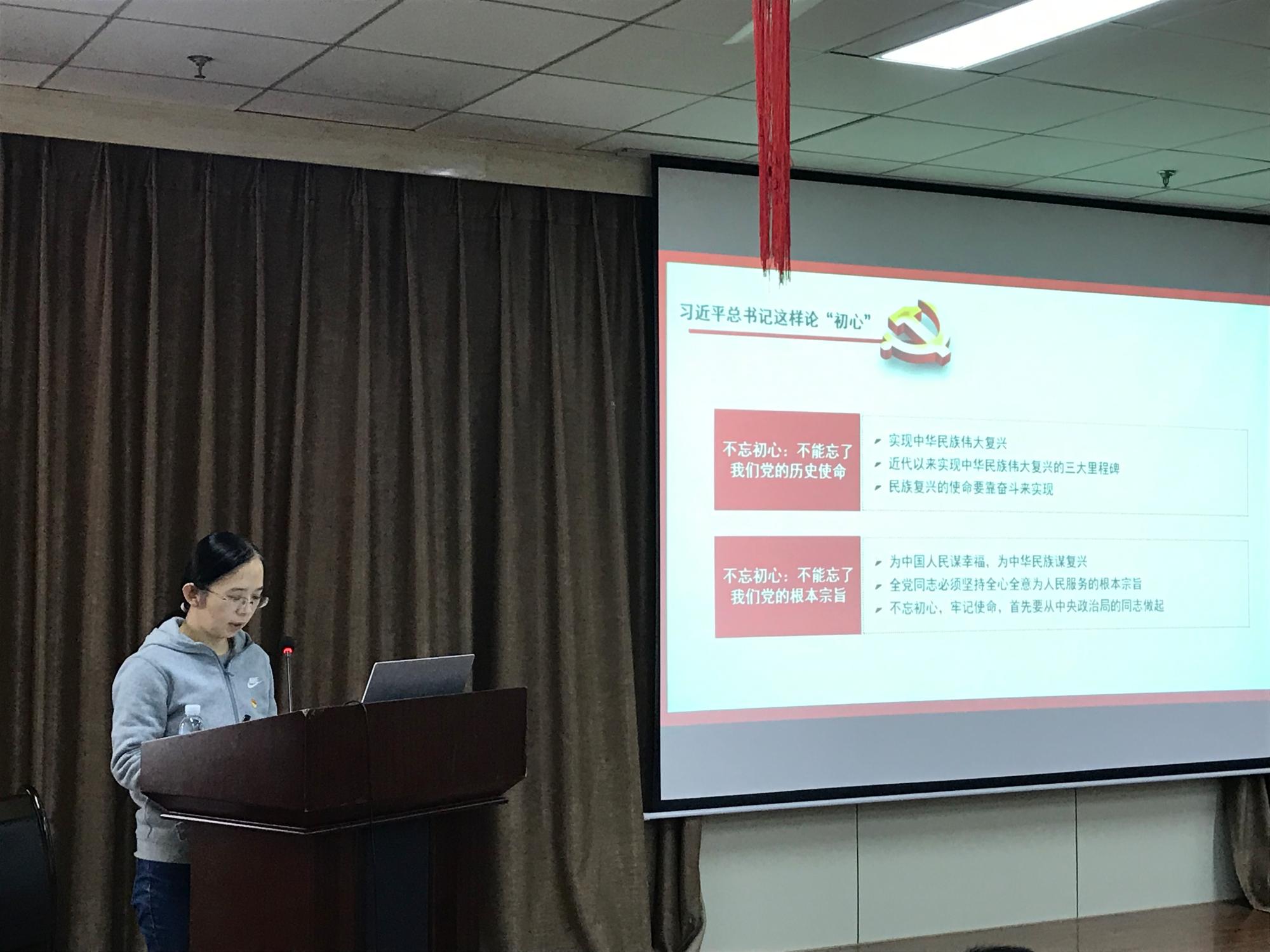 张莹莹首先明确了大学生党支部开展“不忘初心、牢记使命”主题教育,要重点把握“理论学习有收获、思想政治受洗礼、干事创业敢担当”等目标要求。她主要从习近平总书记如何论“初心”、大学生党员牢固树立理想信念,正确把握和担当新时代青年党员的使命等三个方面讲授了党课。