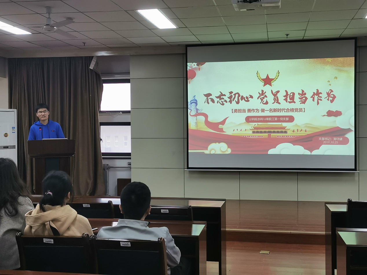 (通讯员 曹佳妮)习近平总书记在十九大报告中指出,要在全党开展 “不忘初心、牢记使命”主题教育活动,用党的创新理论武装头脑,推动全党更加自觉地为实现新时代党的历史使命不懈奋斗。中共中央决定从6月开始,在全党自上而下分两批开展“不忘初心、牢记使命”主题教育活动。10月25日下午五点,计算机科学与技术学院本科2016级软件工程第一党支部在G楼516开展“不忘初心、牢记使命”主题教育党课活动。活动由支部书记郑守建主持。