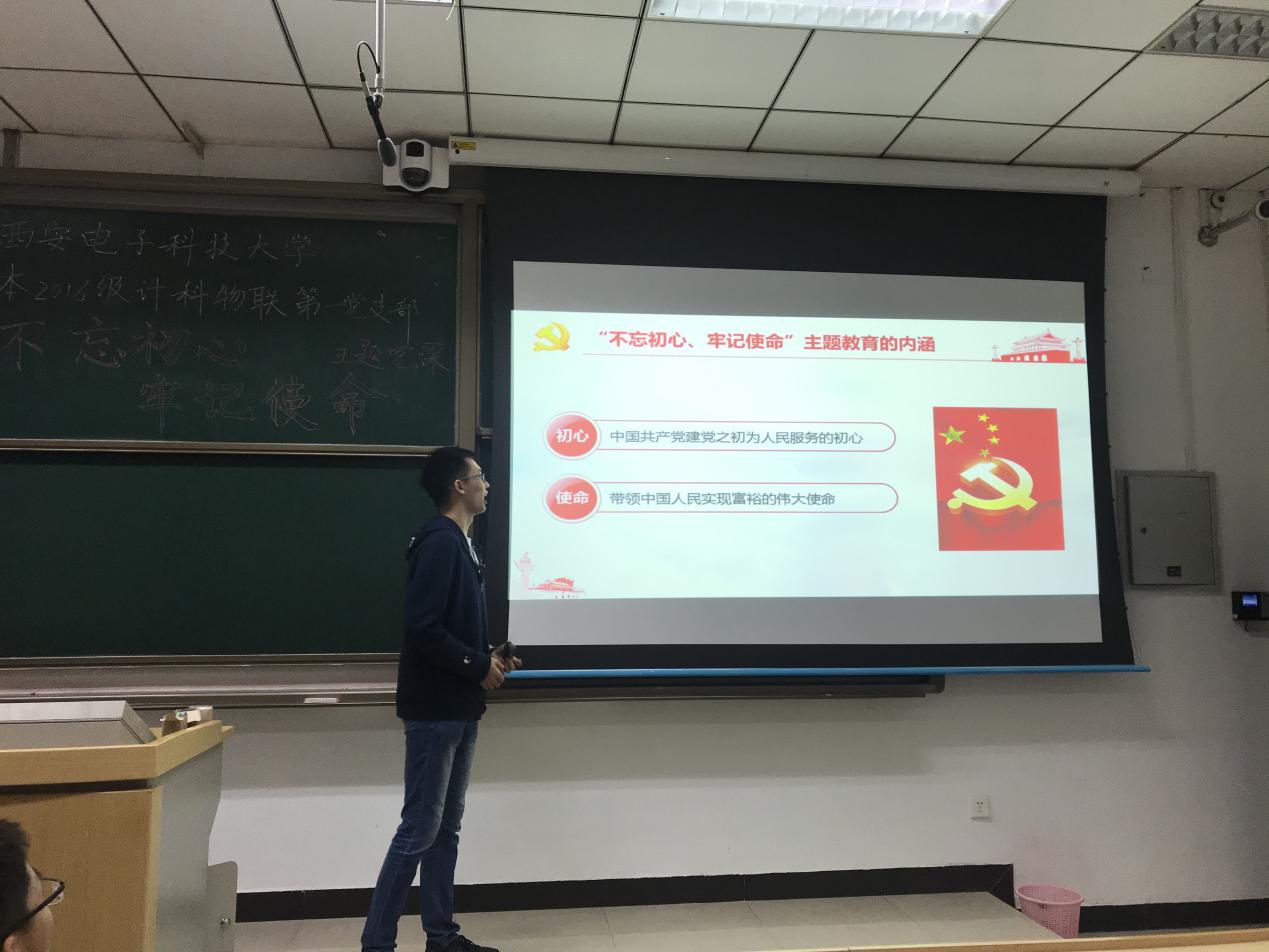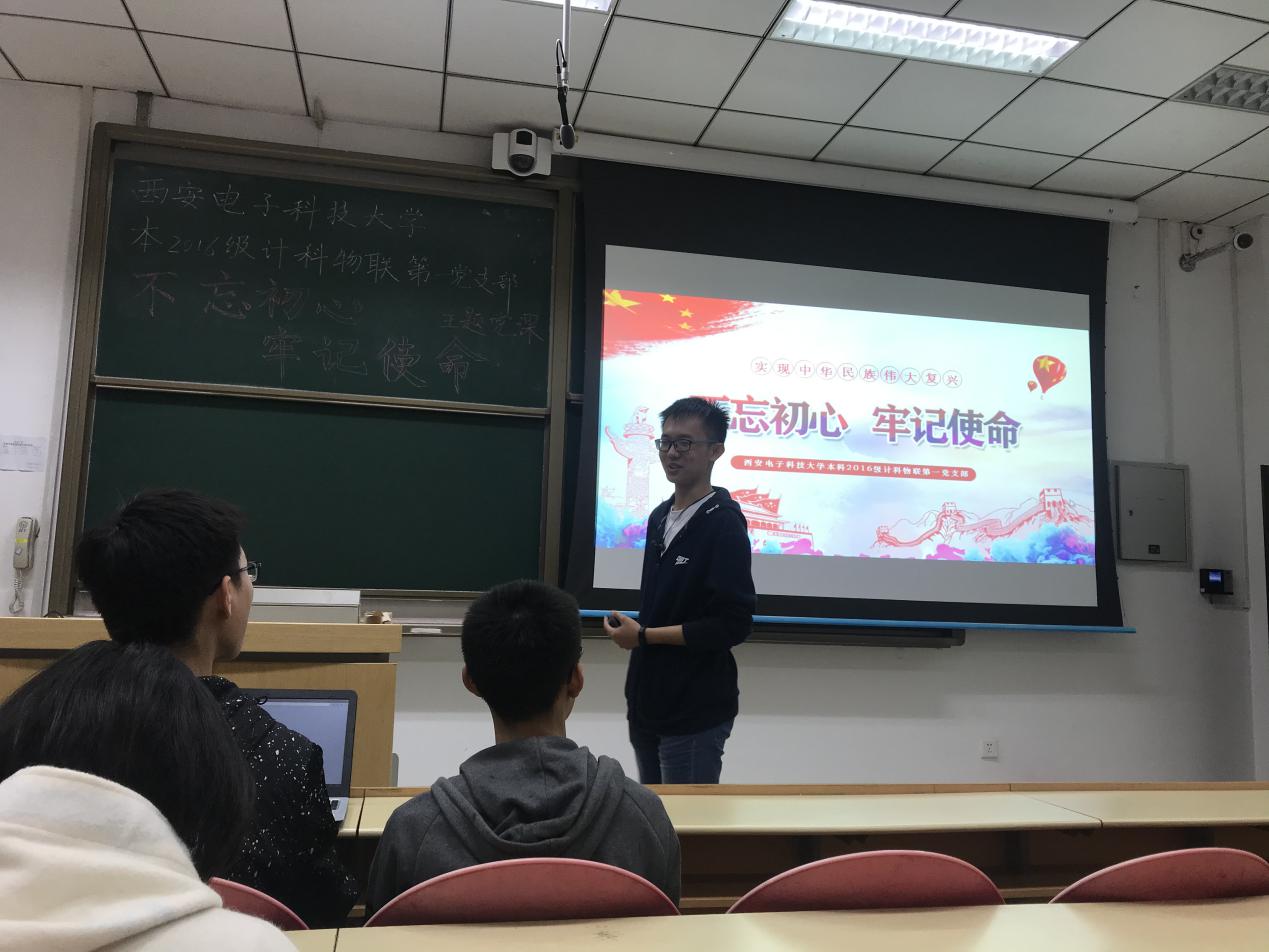 (通讯员 翟恋 徐聪)2019年10月10日,计算机科学与技术学院本科2016级计科物联第一党支部在南校区信远1区118教室开展了“不忘初心、牢记使命”主题党课。计算机科学与技术学院本科2016级计科物联第一党支部副书记张俊华同志作为本次党课的主讲人,将主题党课分为多个模块,与同学们一同探讨了大学生党员应该如何践行“不忘初心、牢记使命”。