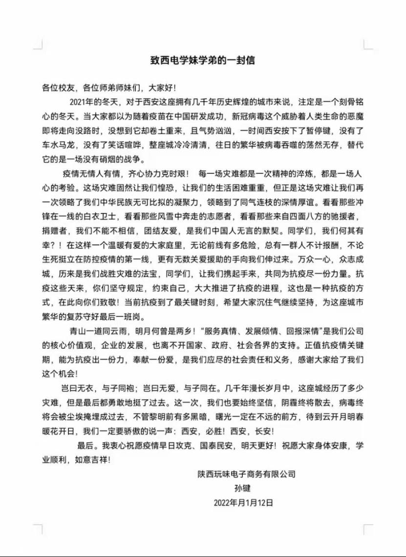 (通讯员 陈龙)当前西安疫情形势有所好转,正在朝着更加积极的方向发展,新年伊始西电计科院93级院友孙键企业陕西玩味电子商务有限公司向学校捐赠了1000箱库尔勒香梨,目前该捐赠物资已经顺利发放,全部送到了广大学生手中。