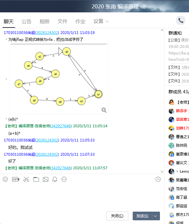 “编译原理”线上教学的第一堂课是由三位老师分别单独授课,整体运行平稳有序。但是三位老师课后回顾授课各个环节和细节,也从中总结发现了一些问题