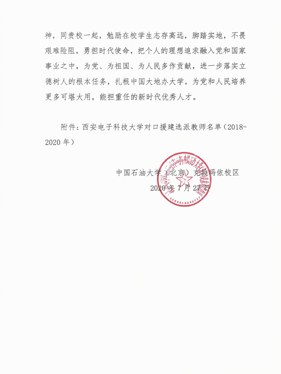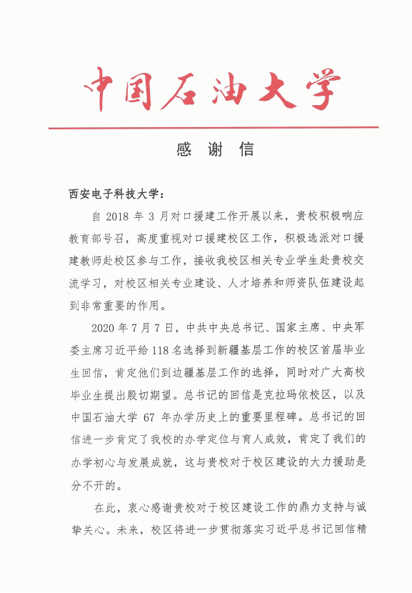 (通讯员 陈龙)为响应教育部号召,对口援建中国石油大学(北京)克拉玛依分校,2018年9月,计算机科学与技术学院选派教学科研经验丰富的牛海军教授前往中国石油大学(北京)克拉玛依分校援建三年,牛海军教授勇于担当、甘于奉献,在援建期间,工作兢兢业业、任劳任怨、无私奉献,开展了大量卓有成效的工作,得到了学校领导、同事和学生们的认可。中国石油大学(北京)克拉玛依分校为表达感谢,专门致电学校,对我校及牛海军教授表示感谢。