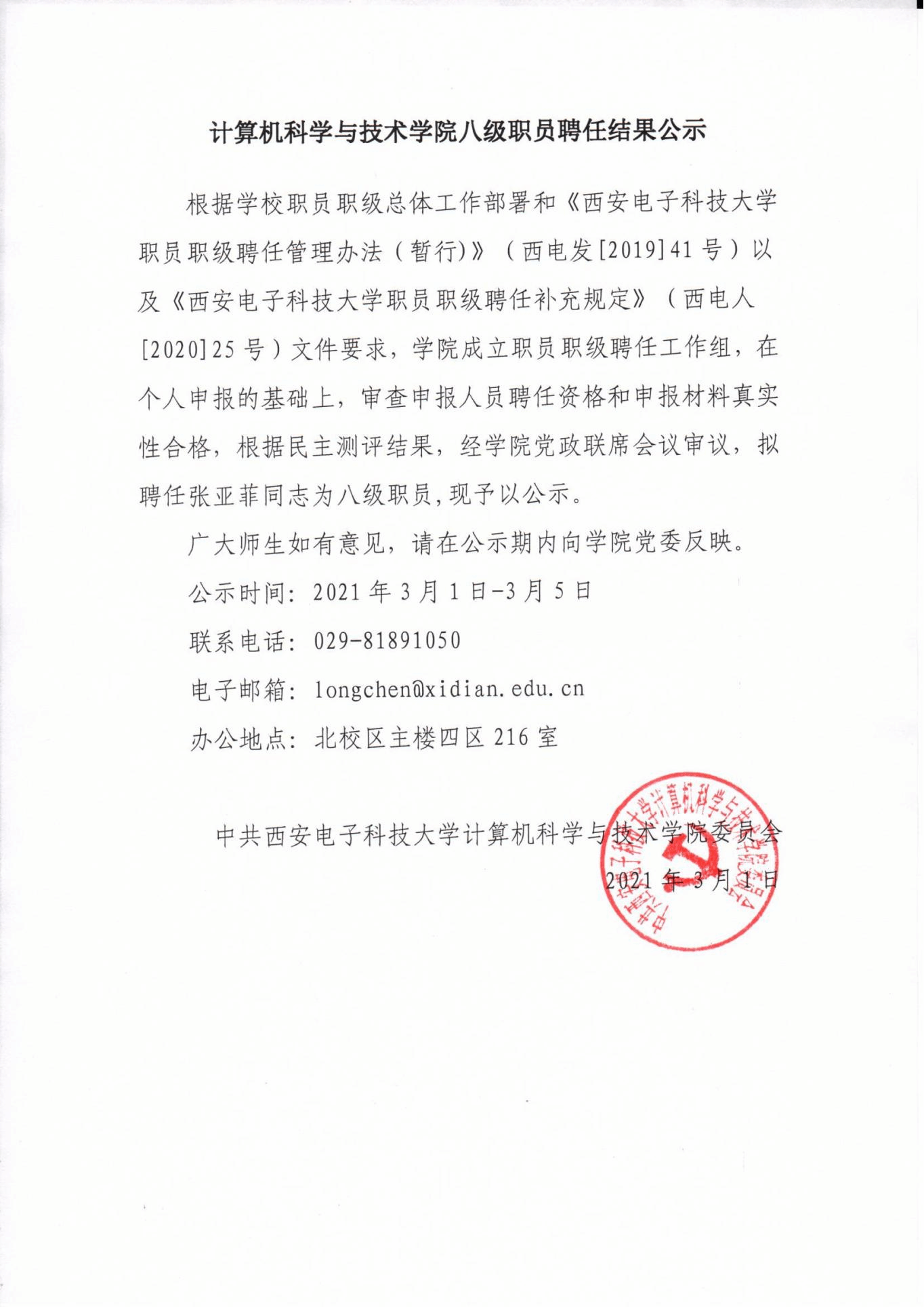 计算机科学与技术学院八级职员聘任结果公示