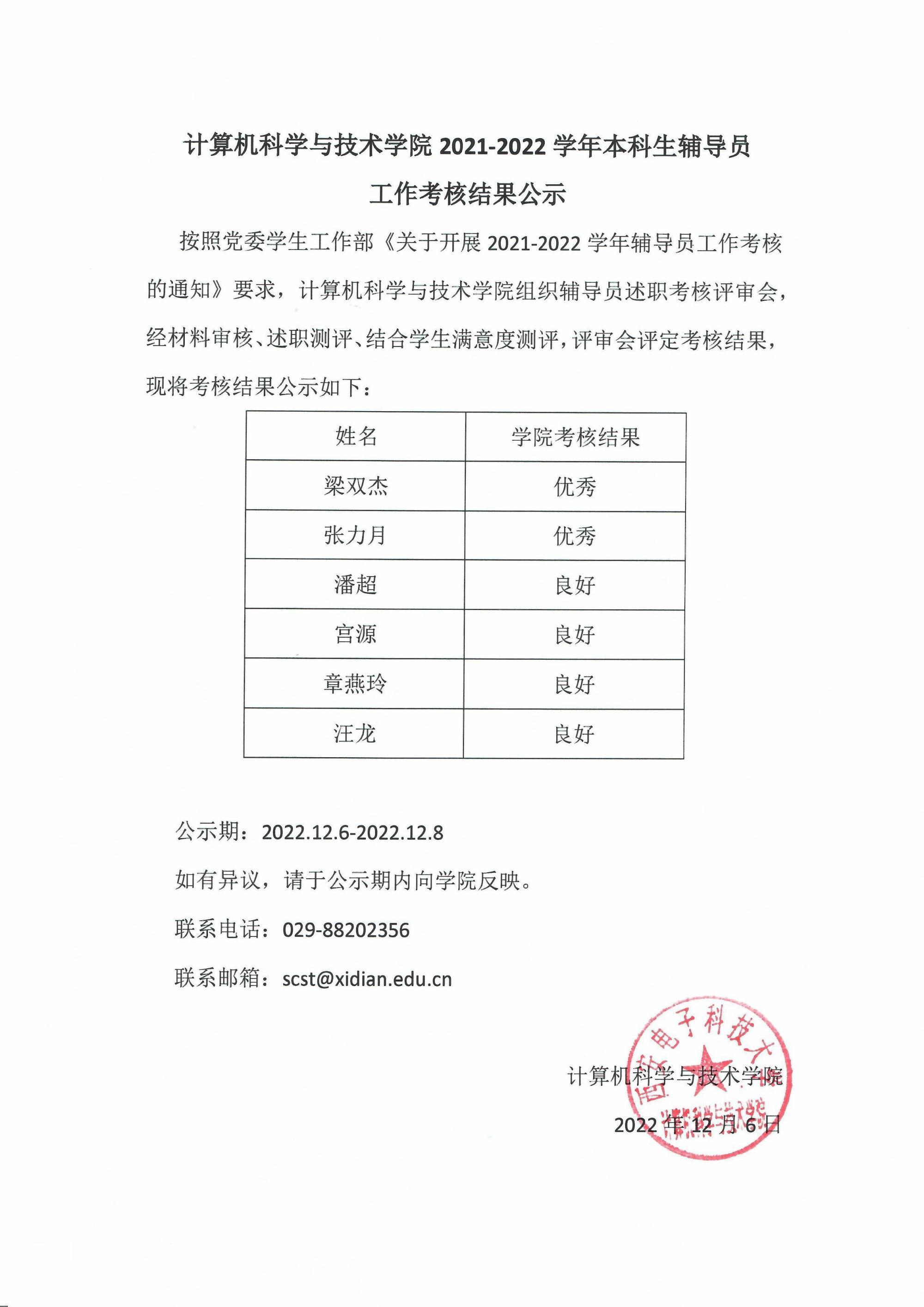 计算机科学与技术学院2021-2022学年本科生辅导员工作考核结果公示